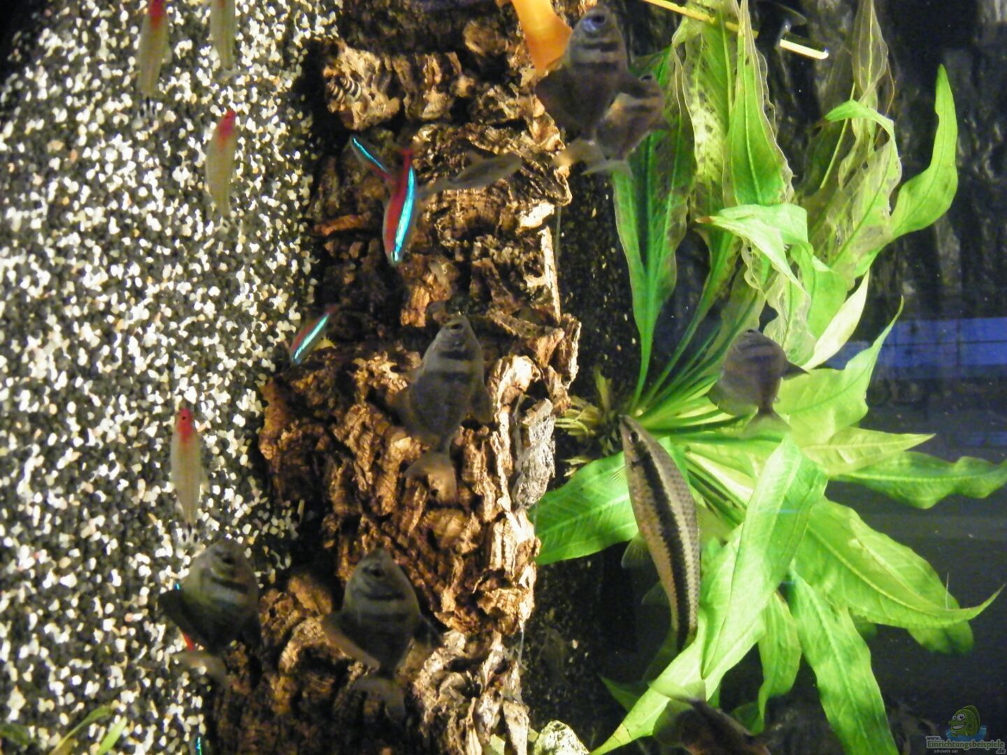 3D-Rückwand (Felsen, schwarz) Korkrinden-Terrasse (Eigenbau) kleine Mangrovenwurzel Stein mit Höhle