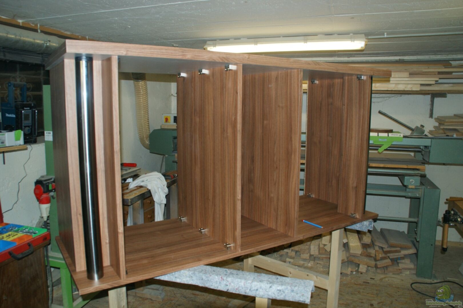 2 Bohrungen in der Rückwand damit diese Hinterschwimmbar ist und beide Ansaugrohre befinden sich dahinter. Das Aquarium selbst ist aus 12mm Glas Sto?? verklebt mit Sicherheitsnaht. Hergestellt von LTE-Aquarien in Haltern am See www.aquarienkontor.de Aquarium Schrank< der Schrank ist Eigenbau aus 22mm starken Platten, er wurde mit Trapezen verbunden so das man ihn wieder komplett zerlegen könnte. Die Deckplatte besteht aus 2x 22mm starken Platten. Also alles in allem sehr stabil. [...]