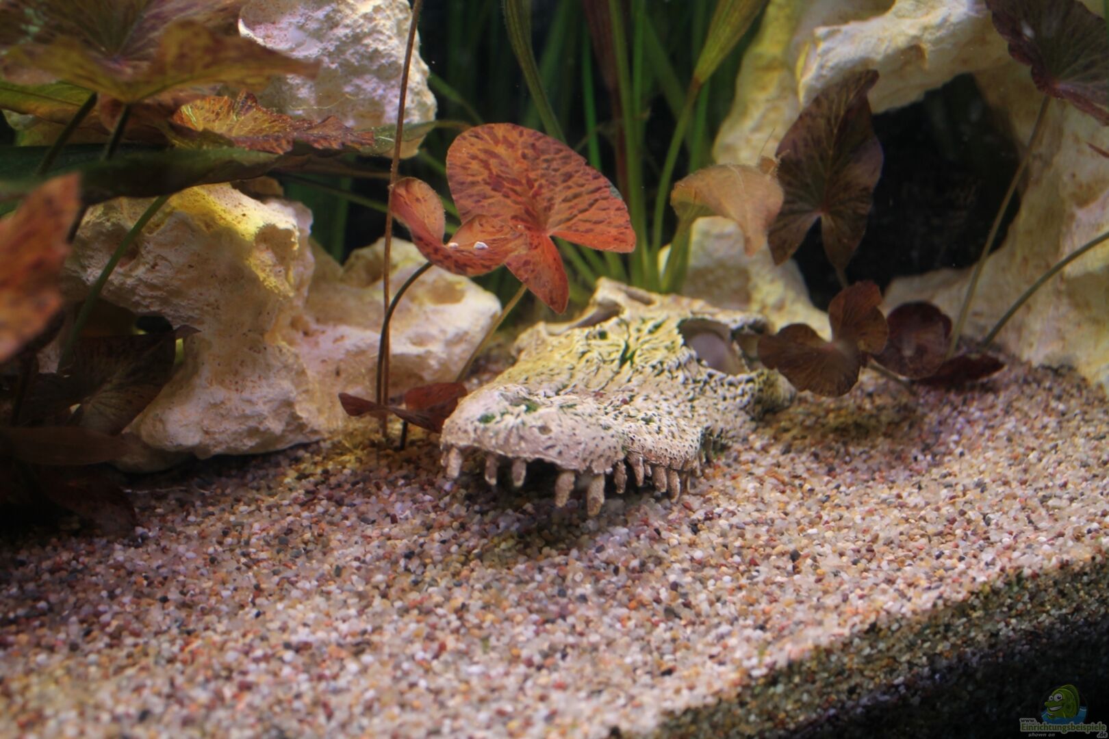Nach dem Grundsatz weniger ist oft mehr, hausen unsere Bodenbewohner in einer "antiken" Tonkaraffe und in einem Krokodieltotenkopf. Des weiteren haben wir helle Kunststein, die doch sehr realistisch wirken, mit Löchern, die als Unterstand für die Leopardbuschfische dienen. Damit unsere Antennenwelse nicht zu kurz kommen liegen einige Holzstücke (teils bewachsen) im Becken. Das alles schön arangiert ergibt ein nettes Gesamtbild!!!