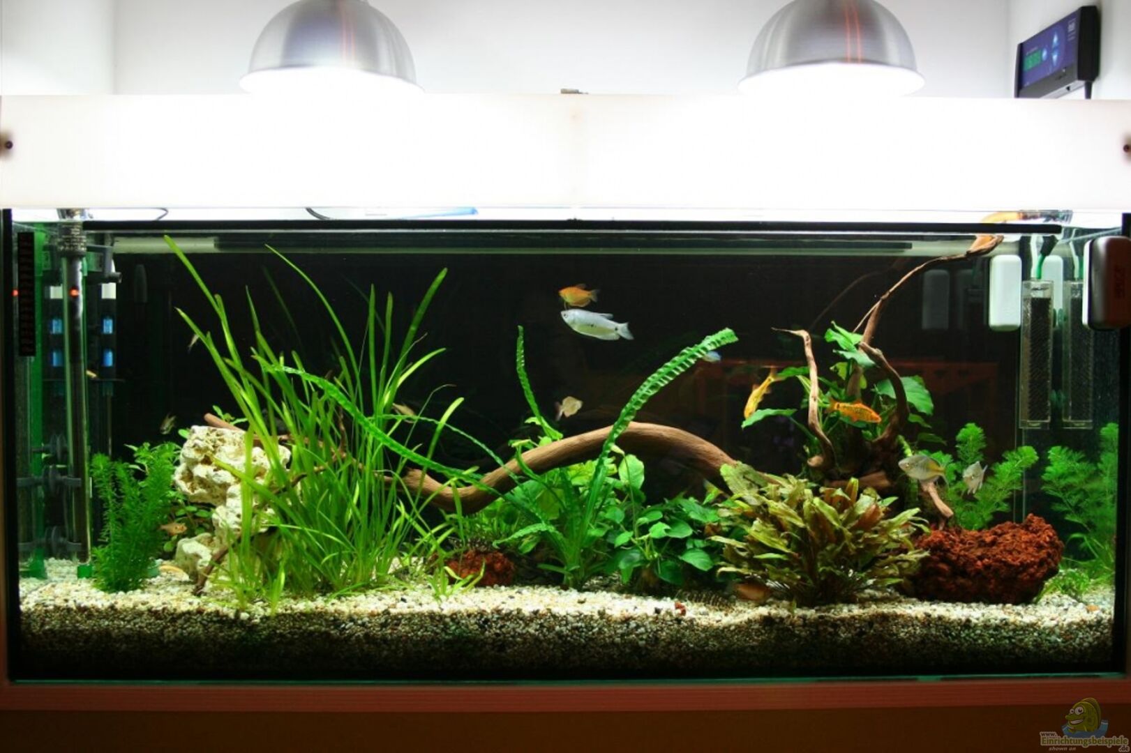 Die Anschlussleitungen der Technik ( Aussenfilter, CO²-Anlage....) werden durch 2 Stk. Kunststoffrohre DN 70 jeweils links und rechts vom Unterschrank aus über das Becken ins Aquarium geführt. Becken nach oben hin offen. Oberhalb des Beckens (Küchenseite) befindet sich eine 15cm hohe Plexiglas-Platte, die ein Herausspringen der Fische verhindert.