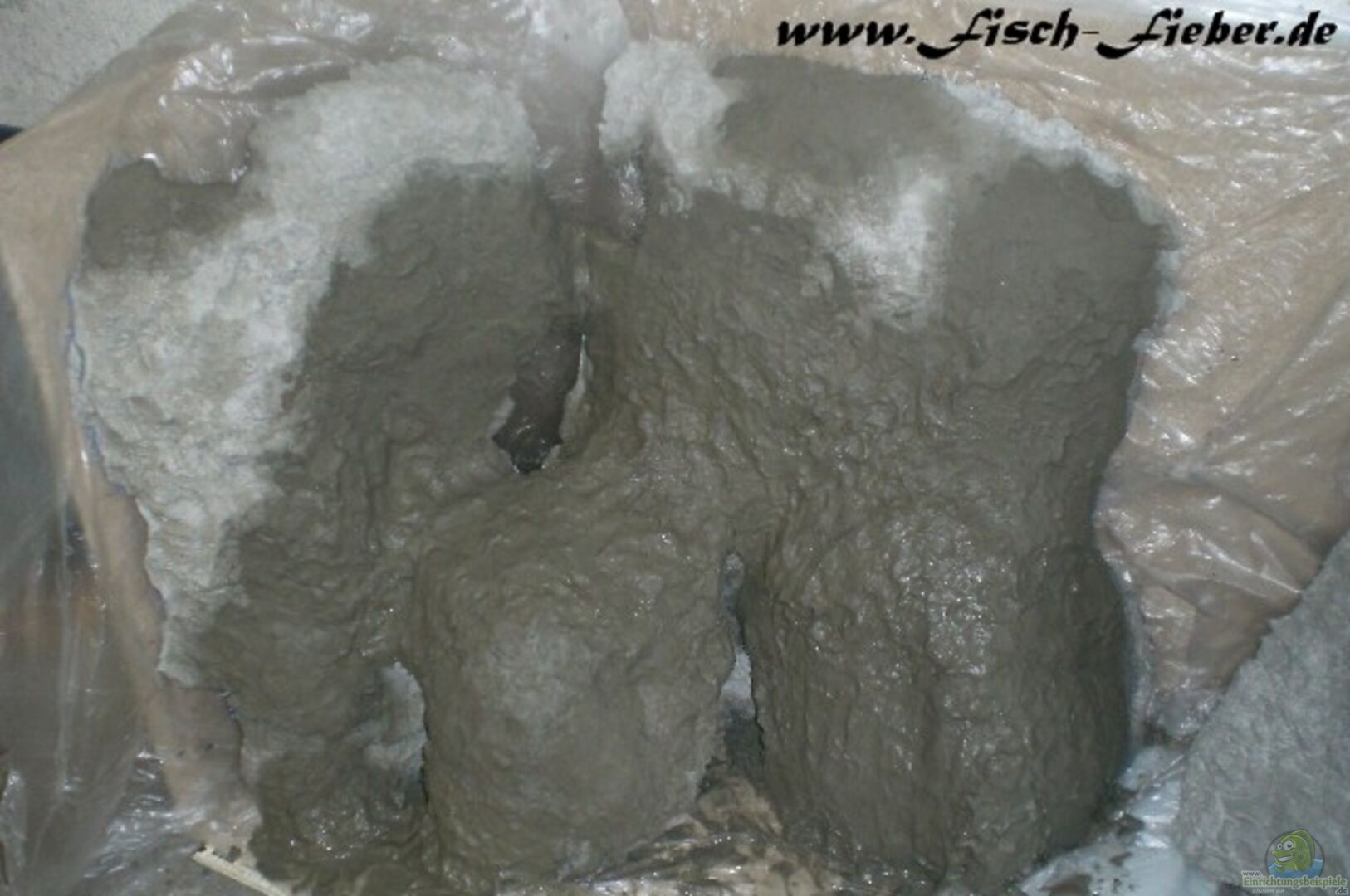 ----- Die hintere Scheibe ist mit blauer Bastelpappe beklebt. Die Dekoration besteht aus selbstgebauten Felsenelementen. Alle Elemente sind hohl und können als Schwimmraum oder Höhlen genutztwerden.