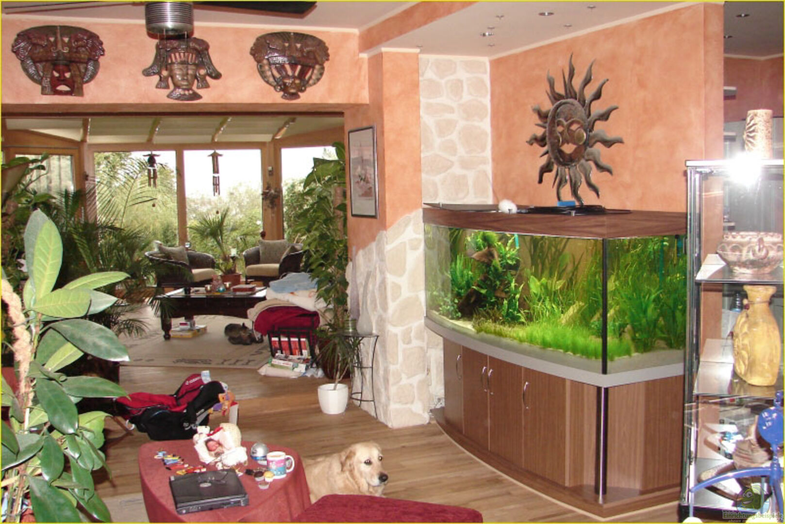 Das Becken ist eine Aquarienkombination mit einer gewölbten Frontscheibe, Unterschrank und Abdeckung im Farbton französisch Nussbaum. Der Unterschrank hat zwei Edelstahlsäulen und die Kiesblende ist ebenfalls in Edelstahllook. Das Aquarium hat zwei Lochbohrungen im Boden sowie eine Ausparrung im Unterschrank um mit den Leitungen in den Keller zu gelangen. Ersteinrichtung fand im August 2005 statt.