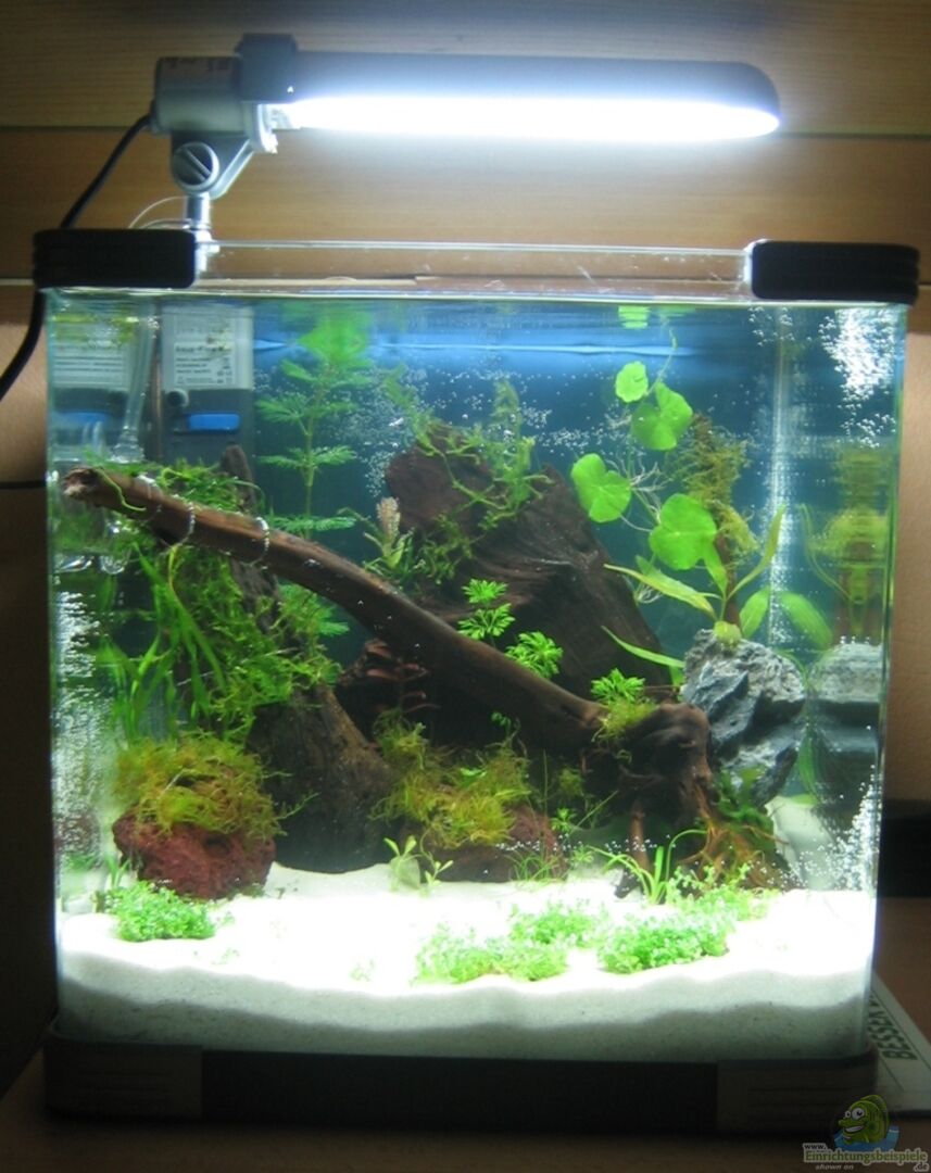offenes Nano Cube Glas Aquarium, mit gerundeten Kanten, daher die rechnerisch unpassende Literangabe. Das Aquarium steht auf meinem Schreibtisch