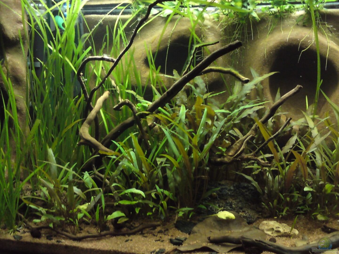 Eigenbaurückwand aus Styropor, Portlandzement und Epoxidharz. Moorkienwurzel und Pflanzentaschen eingearbeitet, eingefärbt und mit Flu??sand abgestreut. Fassungsvermögen: ca. 150 Liter netto. Eigenbau Unterschrank "Buche" von unseren Schreinerlehrlingen.