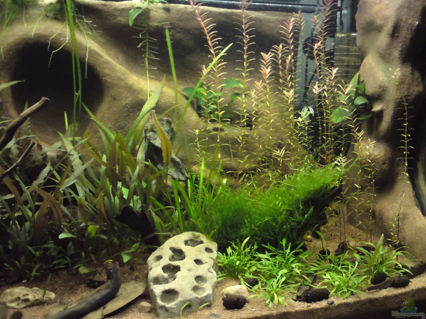 Eigenbaurückwand aus Styropor, Portlandzement und Epoxidharz. Moorkienwurzel und Pflanzentaschen eingearbeitet, eingefärbt und mit Flu??sand abgestreut. Fassungsvermögen: ca. 150 Liter netto. Eigenbau Unterschrank "Buche" von unseren Schreinerlehrlingen.
