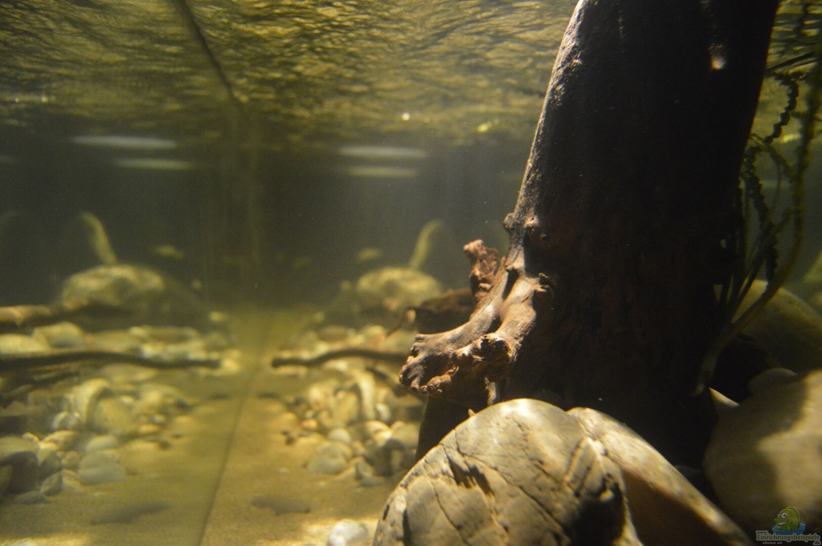Dieses Aquarium hat ein Sonderma?? mit 200x40x40cm. Bewusst wählte ich dieses Ma??, da hier wunderbar ein schnellflie??ender Bachlauf imitiert werden kann. Es ist durchaus nicht üblich eine so geringe Tiefe und Höhe zu wählen, wer jedoch einmal Spa?? daran gefunden hat, will es nicht mehr missen. Die Tiere sind beinah alle mit 10-15cm ausgewachsen ausgenommen der Flösselhechte.