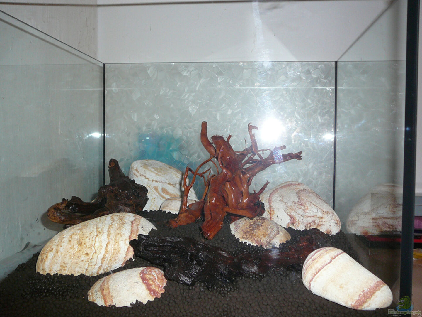 Desweiteren habe ich eine Rote Morkien Wurzel dezentral ins Becken gesetzt auf der die Anubias Nana Bonsai sowie die Bolbitis heteroclita difforms platz finden sollten. Zwei weitere Wurzeln wurde schräg vor und links neben der Hauptwurzel plaziert. Sieben Regenbogensteine verschiedener Grö??e gaben dem Becken seinen Namen und bilden einen schönen Kontrasst zum Grün der Pflanzen und dem dunklen Braun der Wurzeln.