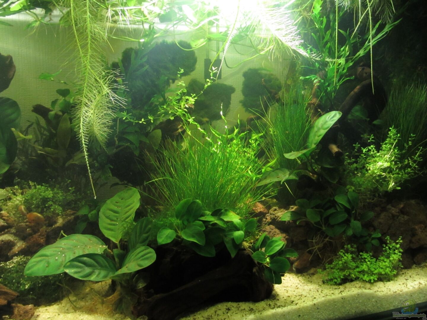 Eingeklebte Terasse aus Plexiglas mit Lavasteinen beklebt. Algenbälle aufgerollt mit Saugnäpfen an der Beckenrückwand befestigt. Holz-Seitenteile, gebeizt als Sichtblende Mangrovenholz an die Rückwand silikoniert und bepflanzt