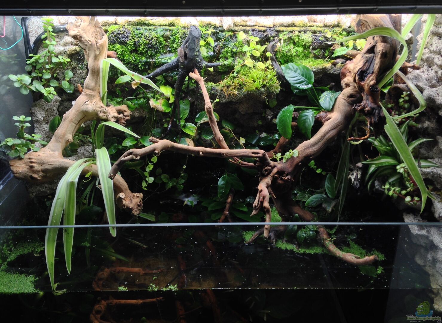 Aufsatz aus Acrylglas, Rückwand und Seitenwand aus Acrylglas und Styropor geformt bzw geklebt. Der komplette Aufbau inkl. Technik ist Eigenbau. Das gefilterte Wasser läuft über die gesamte Rückwand zurück ins Becken, wodurch in der Rückwand ein perfektes Klima für Anubia besteht und das Becken kaum Strömung aufweist. Der Wasserstand im unteren Teil kann variiert werden, da die Filterpumpe ganz unten angebracht wurde.