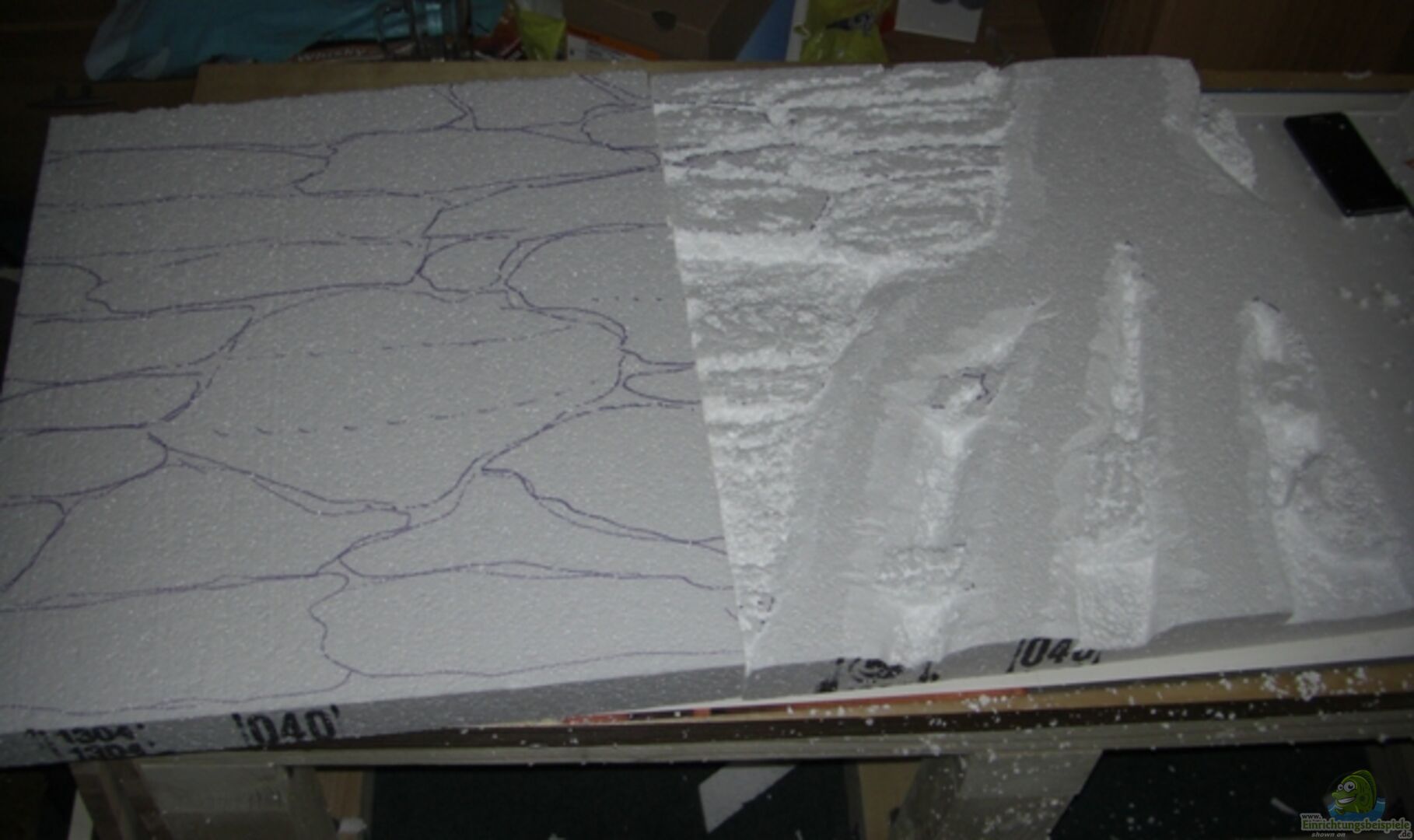 Selbstgebaute Rück- und Seitenwand. 5 cm dicke Styroporplatten wurden im ersten Arbeitschritt auf die passenden Ma??e zurechtgeschnitten, im nächsten Schritt das Design mit Filzstift grob markiert. Danach wurden die Vertiefungen herausgeschnitten und gekratzt (sehr mühsame und viele statisch aufgeladene Styroporbröckchen verursachende Arbeit). Die groben und noch sehr unnatürlich wirkenden Formen wurde durch Bearbeiten mit einem Hei??luftfön etwas geglättet und vertieft. Neben der Rückseite [...]