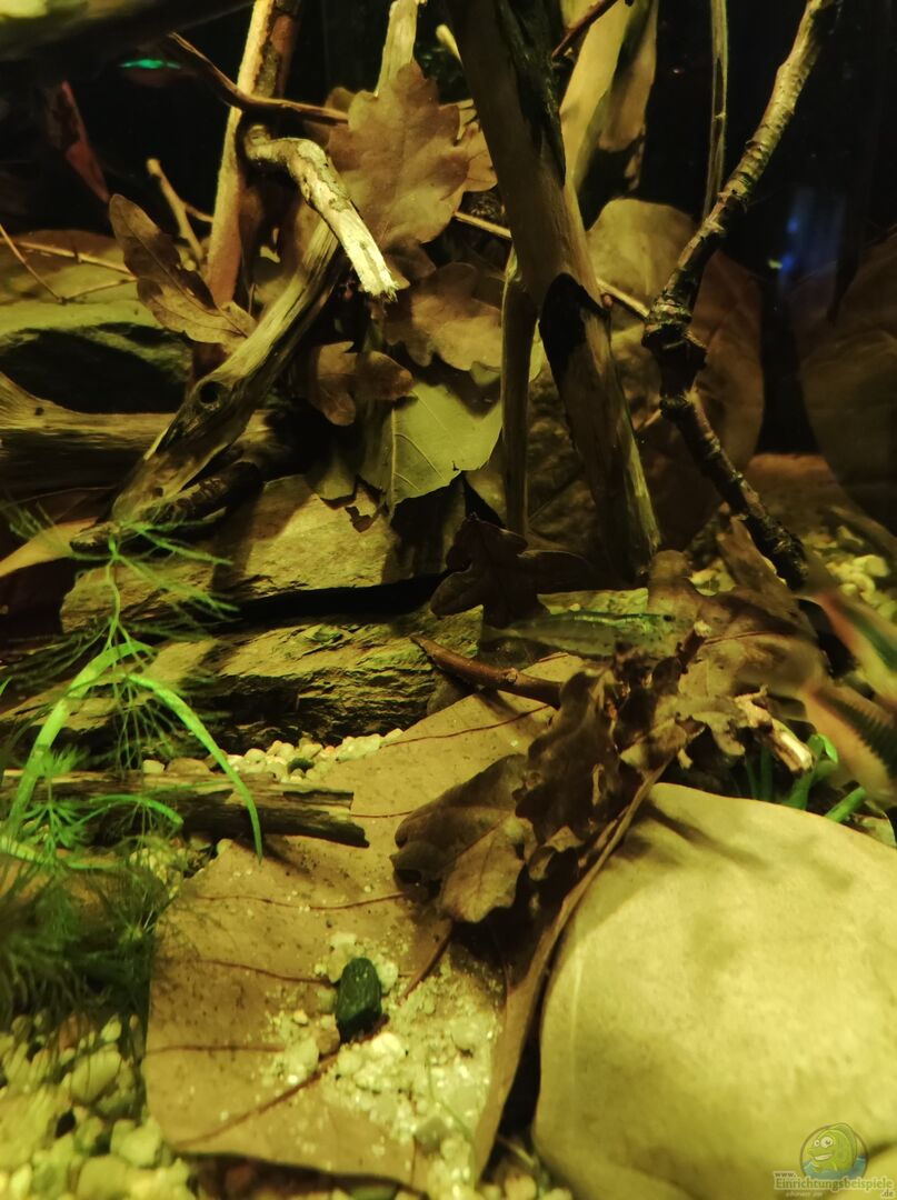 Dieses Becken soll ein kleiner Ausschnitt aus einem Nebenarm des Rio Negros (Uferbereich) darstellen. Ich habe versucht, dies so naturgetreu wie möglich nachzuarmen. Die Grundidee hinter der Aquariumeinrichtung war ein kleiner Nebenfluss am Ufer nachzustellen. Um diese Optik in meinem Aquarium zu kreieren, wurde besonders auf die Echtheit der Natur geachtet. Dafür bieten die zwei Wurzeln, die in das Aquarium ragen, einen zusätzlichen Schutz für die Fische während sie sich im Uferbereich aufhalten. [...]