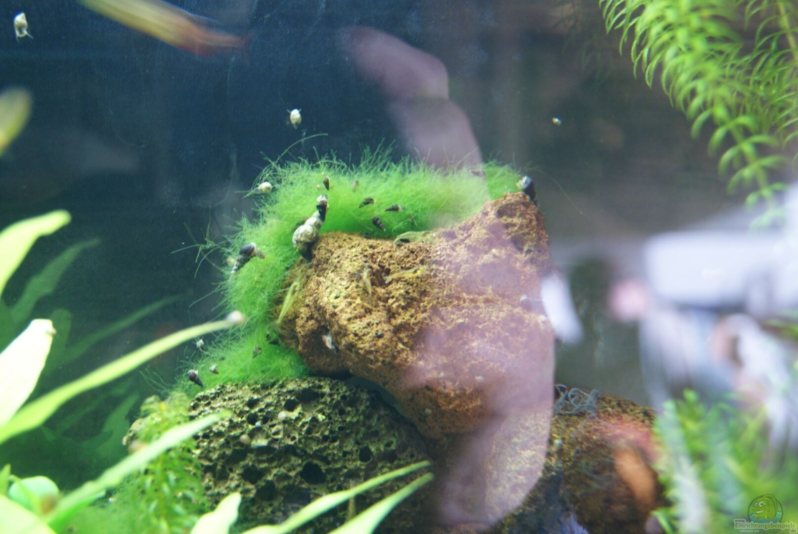 Mopani Wurzel Lavasteine ein selbstgebauter Garnelenstamm (Plastikrohr mit ca. 6 mm gro??en Löchern, mit Aquasilikon bestrichen und mit Kies beklebt), ca. 45 cm hoch Anker aus schwarzem Speckstein, wasserneutral