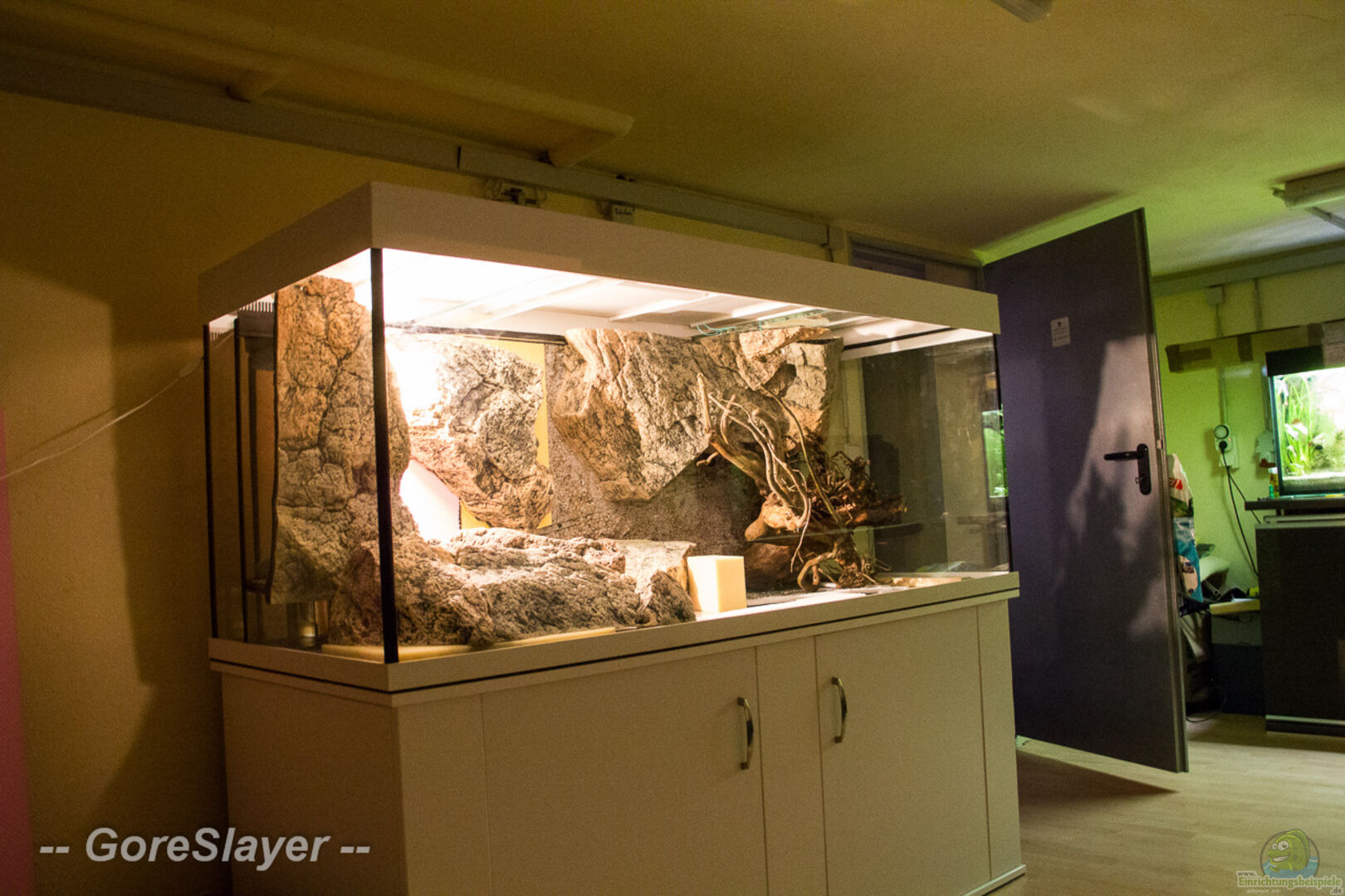 Das Aquarium ist vom Typ: Rechteck und steht im Keller auf einem ProfiLine Stahlschrank (180 x 70 x 74) mit 2 Türen, welche mit einem Softeinzug ausgestattet sind, um Erschütterungen zu vermeiden. Das Schrankdekor, die ABS-Kanten, die Kiesblende sowie die Abdeckung sind in Weiss gewählt wurden. Für die Türgriffe wurde der Typ - Dinia benutzt. Zwischen Becken und Schrank sowie Schrank und Untergrund befinden sich zwei Filz Sicherheitsauflagen. Das Becken ist aus 12mm Floatglas aufgebaut [...]