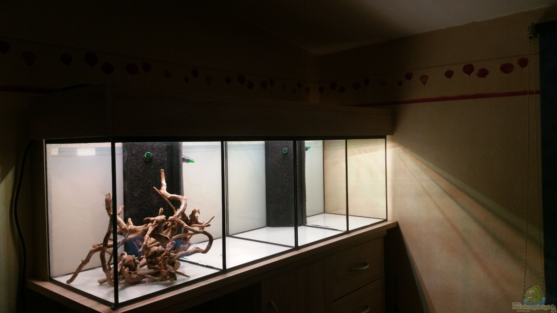 Hallo, Ich habe hir zwei 60x30x35 Aquarien zusammen gestellt in beiden habe ich eine trennscheibe in die mitte eingesetzt die aber nur 23cm lang ist und so mit micht ganz das Becken trennt. Habe dann an der Rückwand und der Mittelscheibe 2cm Plastikwinkel befestigt 4cm Schwarze Filtermatte in Form gebracht im unteren teit geteilt damit wenn ich sie mal auswaschen muss der Bodengrund nicht weg rutscht. Auserdem muste ich die Glasstreifen für die abdekung da wo der Filter ist heraustrenn um [...]