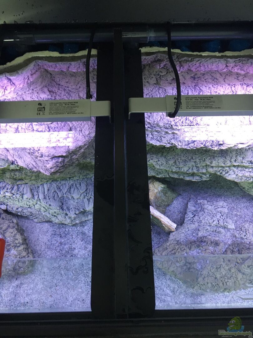 GHL Profilux Light mit Gewitter + Wolkensimulation. Tunze 6085 Strömungspumpe (8.000l/h) über Zeitschaltuhr von 10:00 bis 21:30. Kein Heizstab.