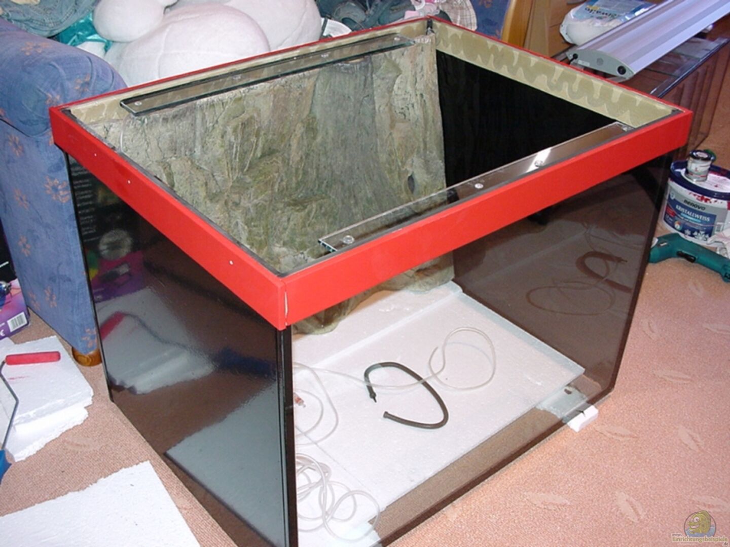 +++++ Aquarium ist eine Sonderanfertigung da es in die vorhandene Stollenwand passen mu??. Stossverklebt mit einer Glasstärke von 10 mm um das ganze stabil zumachen sind vorne und hinten 2 Glasstreben eingeklebt die Abdeckung erfolgt mit zwei Glasscheiben