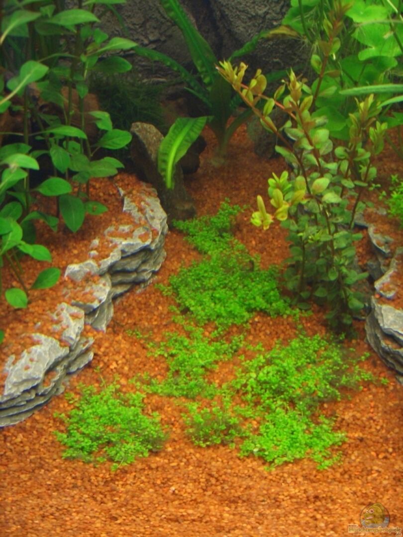 Die Bepflanzung wurde absichtlicht so ausgerichtet, dass nicht nur der Vordergrund als ´Auslaufplatz´ für den Fischbesatz dient; es wurden Pflanzengassen schräg in den Hintergrund geschaffen. Dies (Juli 2009) ist die Erstbepflanung mit ca. 70 Bund/Töpfen, im Schnitt wurden 8 Stengelpflanzen in einem Bund geliefert. Ich werde jetzt einmal den Wuchs abwarten und die ein oder anderen Löcher noch entsprechend auffüllen