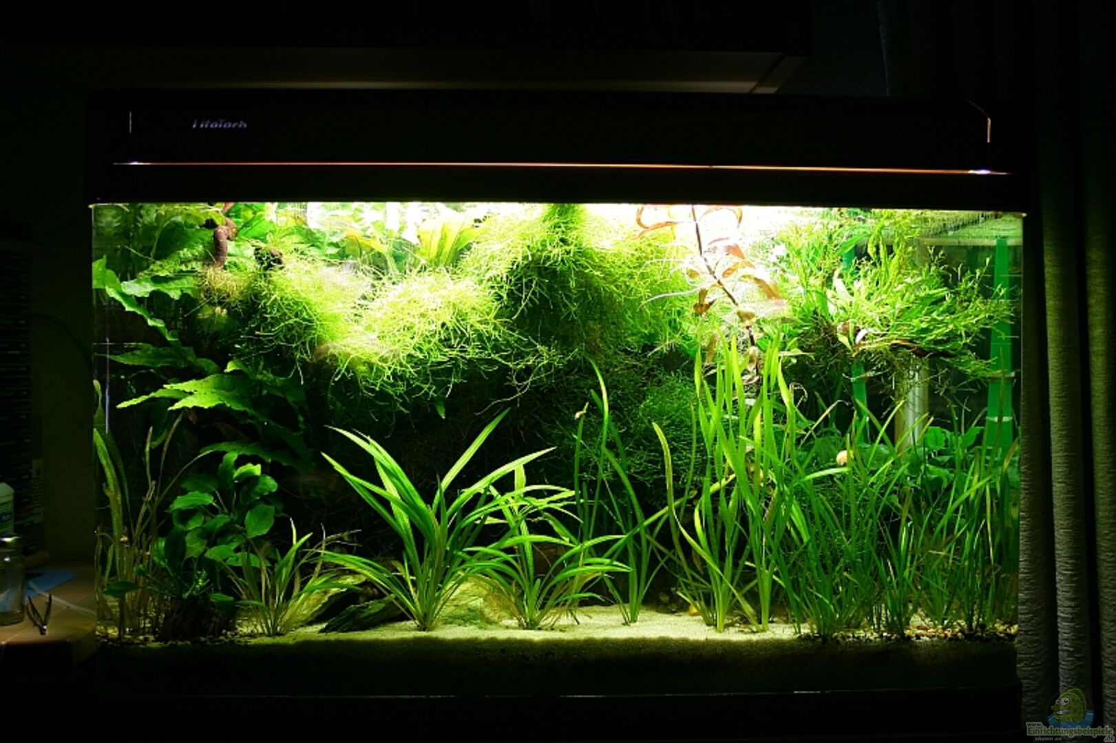 Aquarium ist von LifeTech, mit passender Abdeckung und passendem Unterschrank aus Eiche. Die Frontscheibe und die Seitenscheiben sind ein Element.