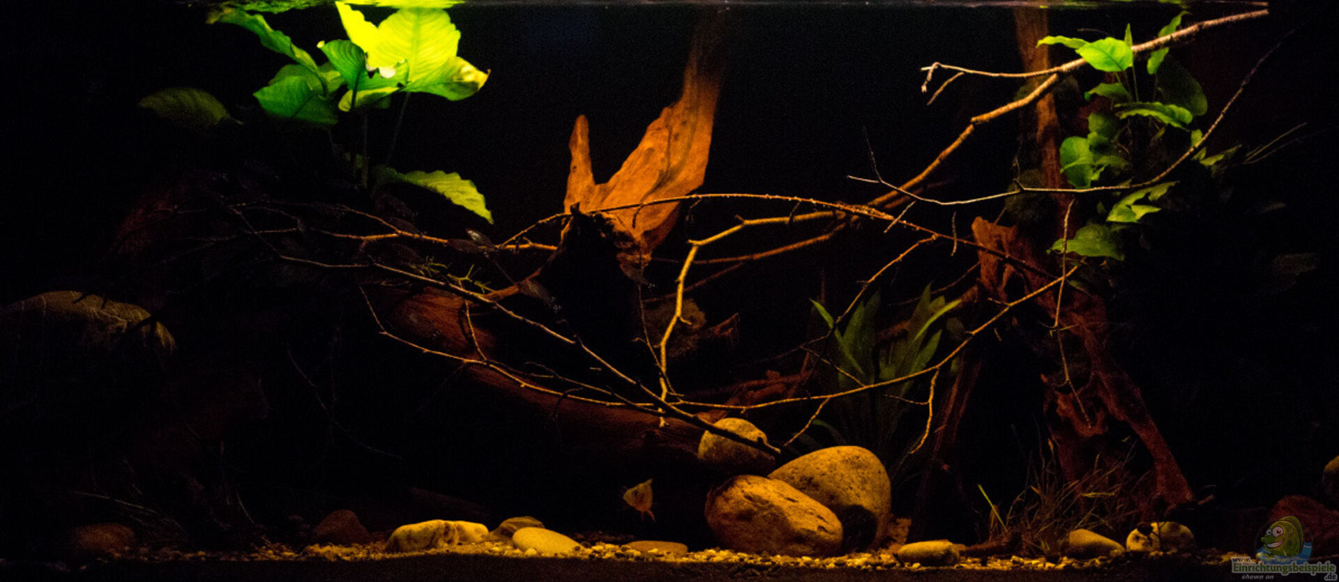 Das Aquarium ist ein Standardbecken mit Sto??verklebung ohne ??nderungen. Als Abdeckung dienen Plexiglasscheiben. DIe LED-Beleuchtung wurde in einem Lichtkasten aus Holz verbaut (Selbstanfertigung). Dieses Becken lief bereits von Juni 2005 bis Oktober 2014 mit einem Malawi-Besatz, dieses Becken wurde nun frei durch ein Nachfolgebecken und ein leeres Aquarium ... nein, das ging dann doch nicht .....