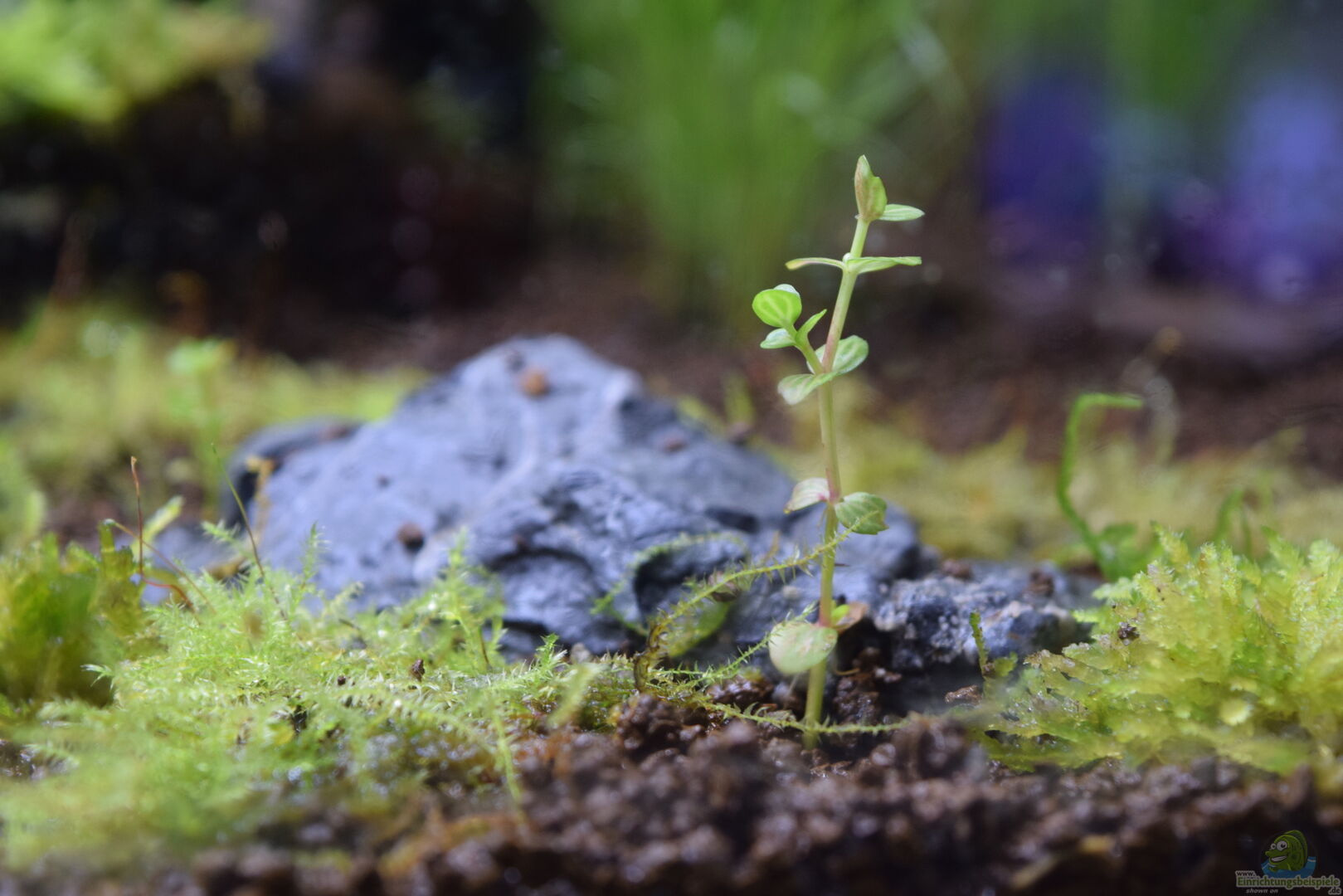 Cyperus zumula (Katzengras), Cyperus haspan, Eleocharis Xingu, emers vorgezogenes Javamoos und Leptodictyum riparium, Salvia natans, Microgramma vaccinifolia, Neoregelia Akeso, Vriesea correia aurajoi, Tillandsia festucoides,