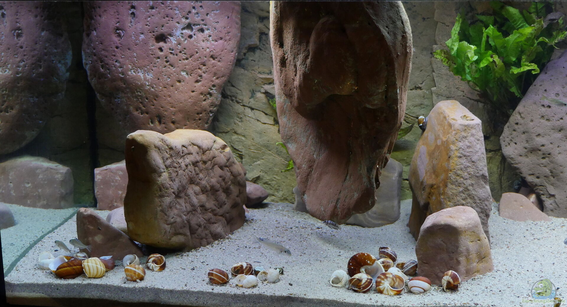 Standardbecken der Firma Aquarienkontor aus Haltern am See - Glasstärke 12 mm, Front- und Seitenscheiben aus Wei??glas - Unterbau aus Aluminiumprofilen mit Scherwänden aus 15mm starken Siebdruckplatten - Eingeklebte Back to nature Slimline Red Gneis Rückwand. Ziel des Projekts war es, steile Felswände (Rückwand und hängende Felsmodule) als Lebensraum für Cyprichromis sowie eine durch stehende Felsen gut gegliederte (Reviergrenzen), sandreiche ??bergangszone nachzubilden, in der sich [...]