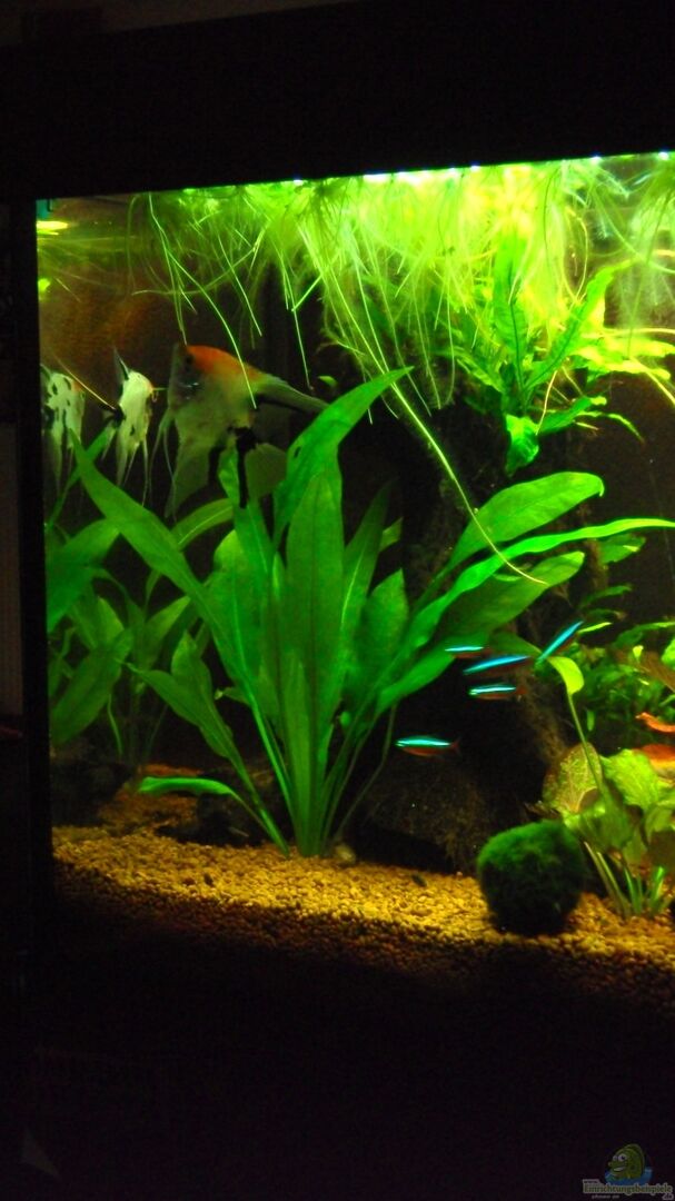 Typ: Juwel Rio 240. Das Becken steht als Raumteiler zwischen Wohn- und Essbereich. Es kann von 3 Seiten eingesehen werden, was die Gestaltung ziemlich erschwert, da es ja von allen Seiten einigerma??en gut aussehen soll. Eine Seitenwand (die an der Wand steht) wurde an der Innenseite des AQ mit "Struktur- Rückwand" von Juwel beklebt.