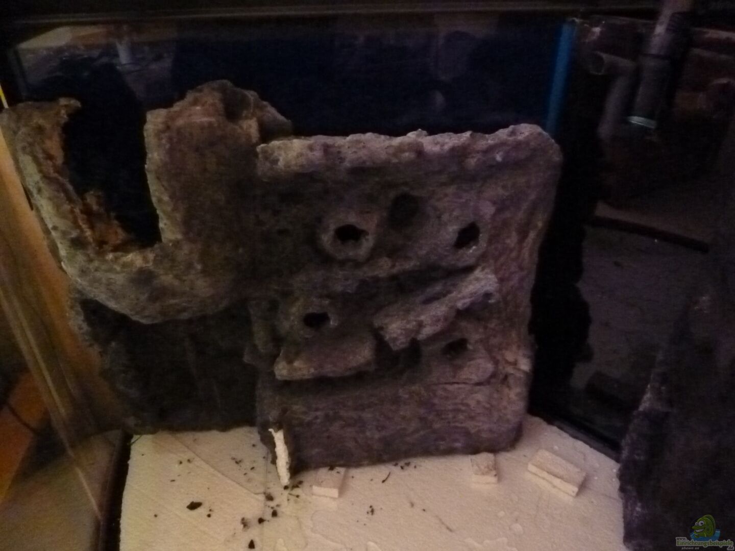 Die komplette Dekoration wurde aus Styropor und eingefärbten weißen Zement ( 20kg) selbst hergestellt. Linke Rückwand beherbergt Tunze-Strömungspumpe sowie 2 Höhlensysteme In der rechten Rückwand ist die Filteransaugung sowie 3 Höhlensysteme integriert. Auf beiden Wänden ist eine hinterschwimmbare Galerie vorhanden. Mittig fungiert ein schmaler hoher Fels mit Höhle und großen durchschwimmbaren Loch als Raumteiler mit Revierfunktion. Davor befindet sich eine Felsmauer mit 2 Höhlen [...]