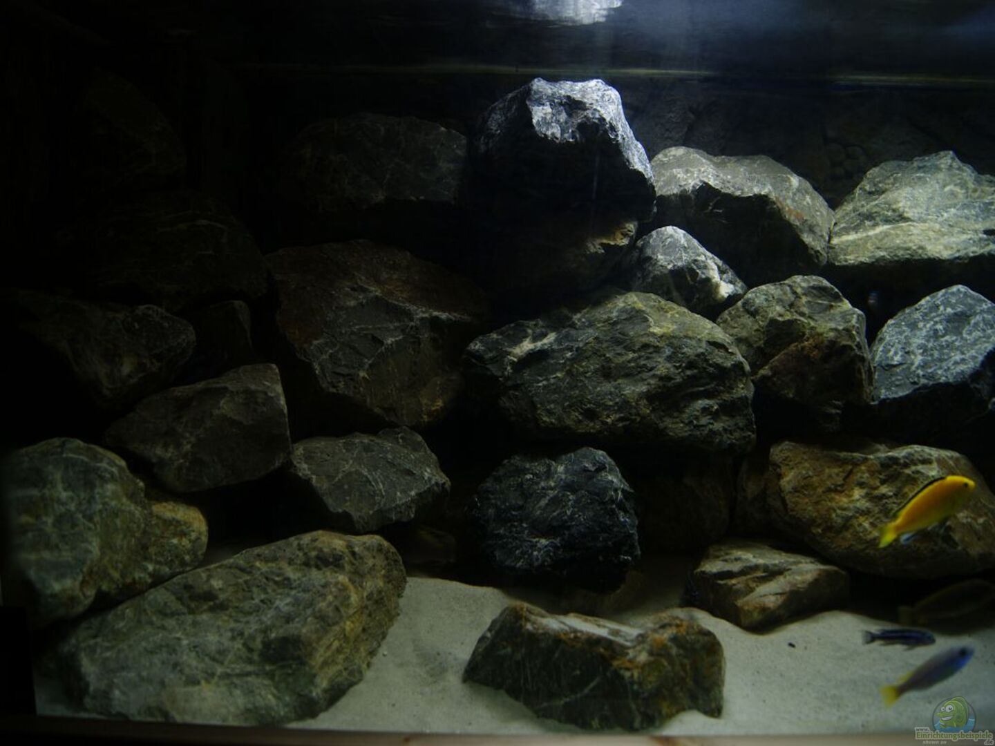 Juwel Stone Line Rückwand an den Rück- und den Seitenscheiben ca. 300 kg graue Basaltsteine vom Natursteinhändler im Hintergrund und den Seitenbereichen angeordnet, so dass viele Rückzugsmöglichkeiten entstehen und im vorderen Bereich noch viel freier Schwimmraum verfügbar bleibt.