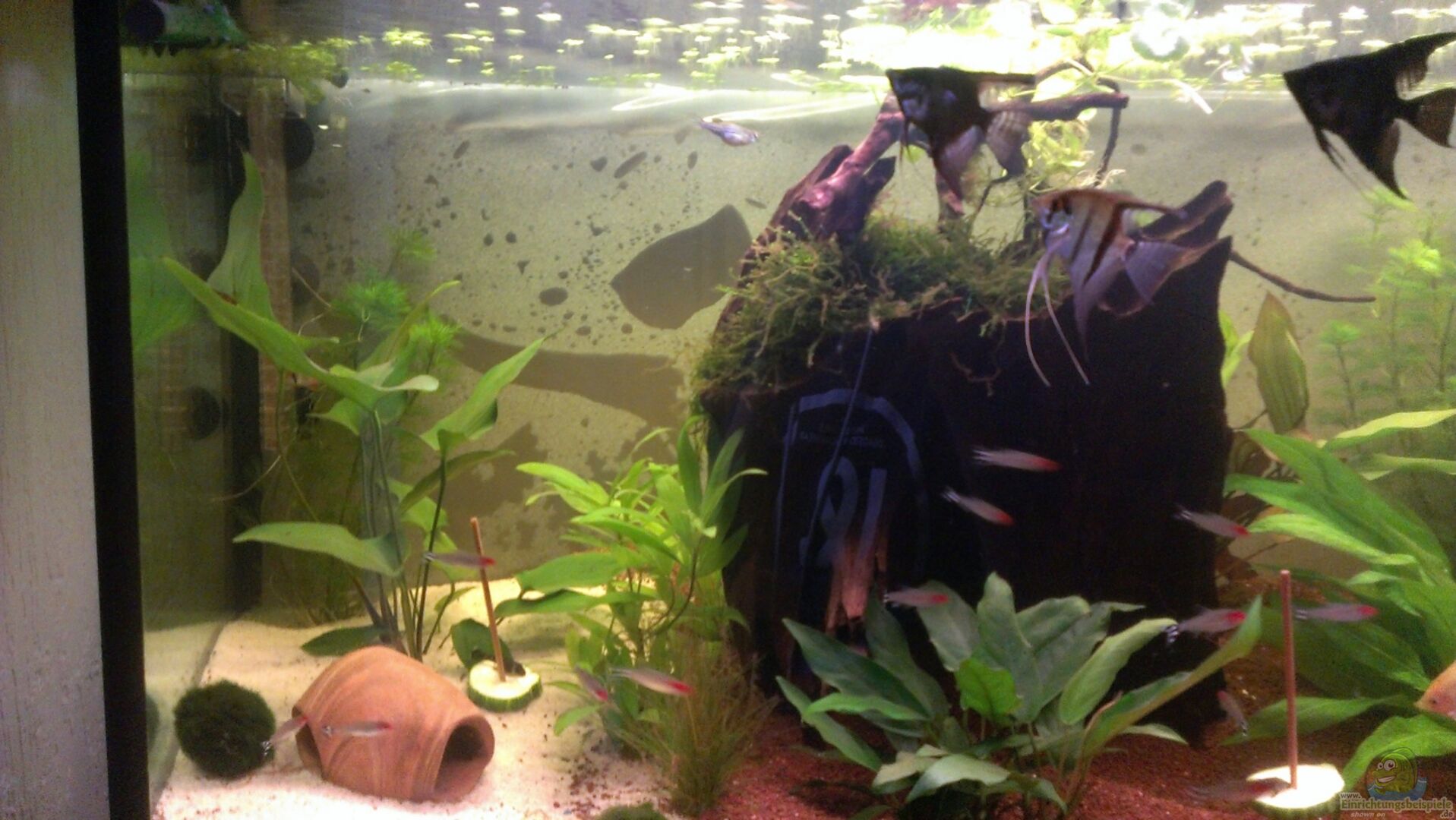 Das Aquarium ist von der Marke Hagen und hat eine Gebogene Frontscheibe (an den seiten 40cm Breit und in der mitte 50cm breit). Die Hintergrundscheibe ist beklebt mit milchiger Folie (ist eigentlich für badezimmer gedacht). Hinterm Aquarium habe ich einen selbstangefertigten Karton geklebt. Im Karton ist eine 1m lange LED-Stripe verbaut. Die LED´s wurden als Nachtlicht eingestezt. !!! Hintergrund wurde gegen Schwarze Folie getauscht, bilder bleiben als Beispiel!!!