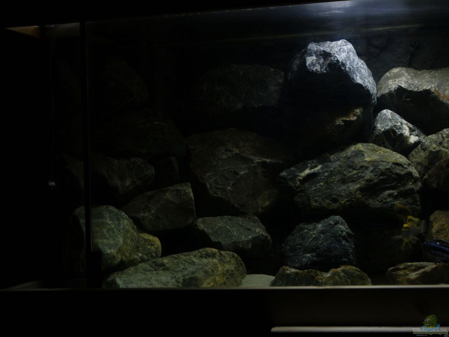 Juwel Stone Line Rückwand an den Rück- und den Seitenscheiben ca. 300 kg graue Basaltsteine vom Natursteinhändler im Hintergrund und den Seitenbereichen angeordnet, so dass viele Rückzugsmöglichkeiten entstehen und im vorderen Bereich noch viel freier Schwimmraum verfügbar bleibt.