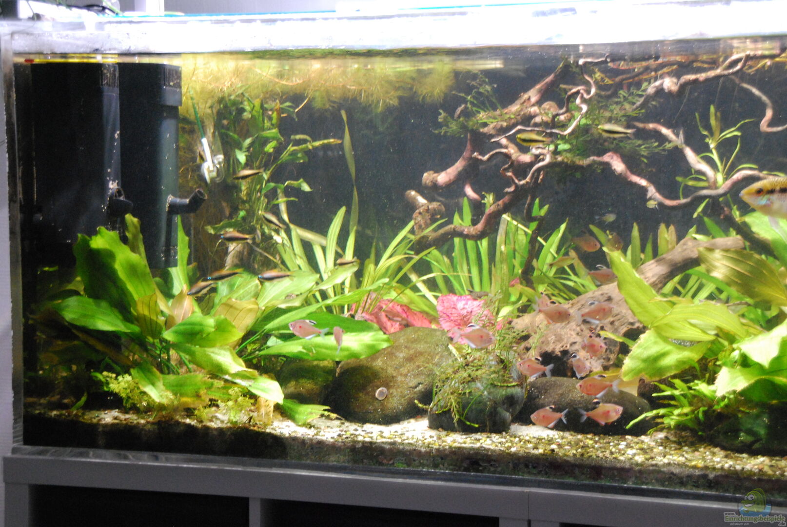 Acrylglas Aquarium, welches nach meinen Vorgaben gebaut wurde. Es besteht aus 15 mm Acrylglas und hat einen oberen Rahmen, damit die Scheiben sich nicht wölben. Das Becken wird nächsten Monat 10 Jahre alt. Es steht auf Röhrenspan-Regalen eines schwedischen Möbelhauses und hat schon 3 Umzüge überlebt.