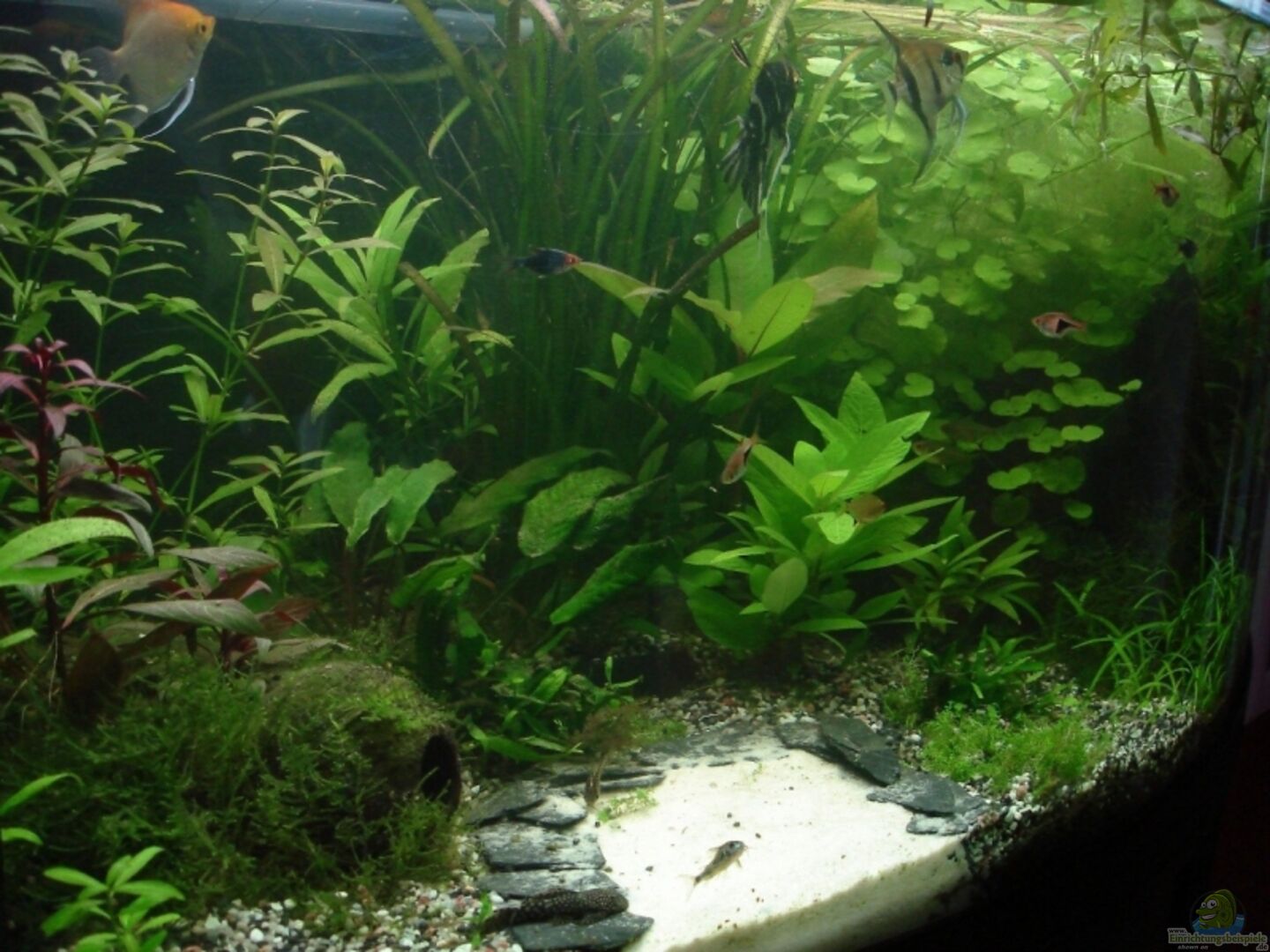 Vordergrund: Vesicularia dubyana - Javamoos - teilweise auf und an den Wurzeln Hemianthus callitrichoides Cuba - Zwerg-Perlkraut Rotala rotundifolia - Kleinblättrige Rotala Anubias barteri nana - Zwergspeerblatt Mittelgrund: Anubias barteri ???Coffeefolia??? - Kaffeeblättriges Speerblatt Cryptocoryne wendtii Hygrophila corymbosa - Kirschblatt-Riesenwasserfreund Ludwigia glandulosa - Rote Sternludwigie Hintergrund: Hygrophila polysperma - Indischer Wasserfreund Vallisneria [...]