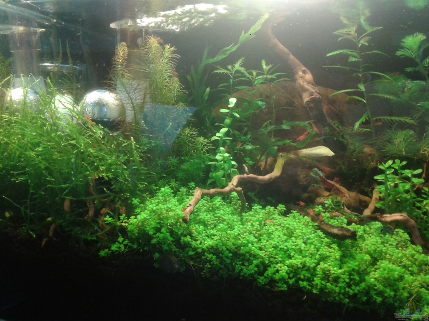 Zuchtbecken für Rote Taiwan Sakura Garnelen. Alle 3 Becken sind ein wenig im Aquascaping-Stil angelegt und sind durch den starken Pflanzenwuchs passend für die Bedürfnisse der Garnelen eingerichtet. Rückscheibe + eine Seitenscheibe sind für mehr Tiefenwirkung mit schwarzer Folie beklebt.