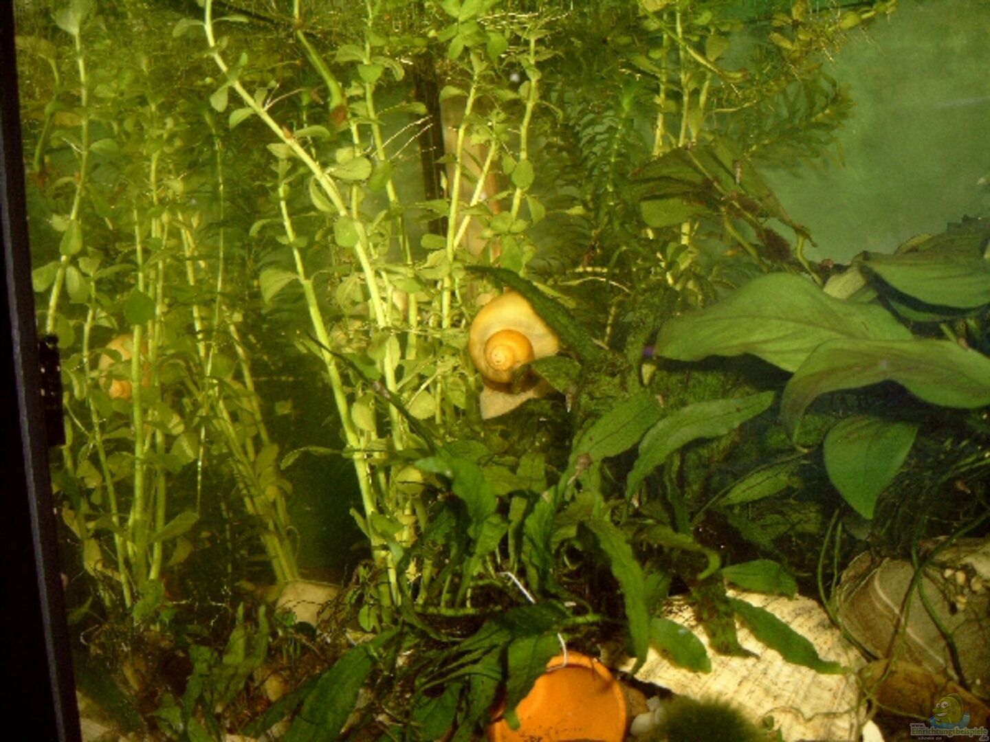 Das Becken fasst zwar 54l, es ist aber nicht ganz bis oben hin gefüllt. Optisch ist das sicherlich nicht sonderlich ansprechend. Aber ich habe mich dennoch dazu entschieden, da mir die Pflanzen, die oben aus dem Wasser ragen, ansonsten verbrennen. Au??erdem konnte ich beobachten, da?? die Zwergkrallenfrösche sich bei abgesenktem Wasserstand fast täglich an der Wasseroberfläche sonnen und dazu teilweise sogar auf die herausragenden Pflanzen kriechen.