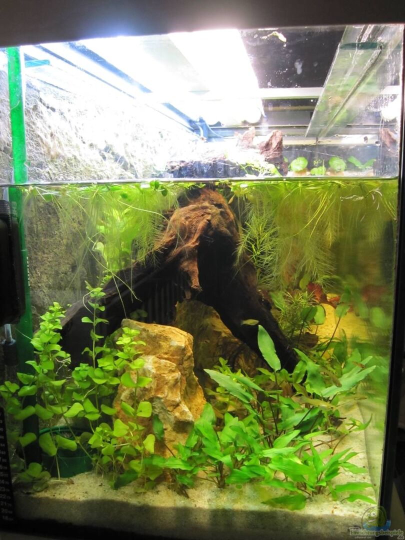 *diverses Kalkgestein aus dem Garten (auf eine 1cm dicke Styroporplatte direkt auf dem Aquarienboden aufgebaut; so können es die Schneckenbuntbarsche nicht untergraben) *grober Kies (>8mm) und Kies (5-8mm) zur Aufschüttung des Landteils *2 Mangrovenwurzeln Grö??e L *ca. 30 Tanganjika-Schneckenhäuser