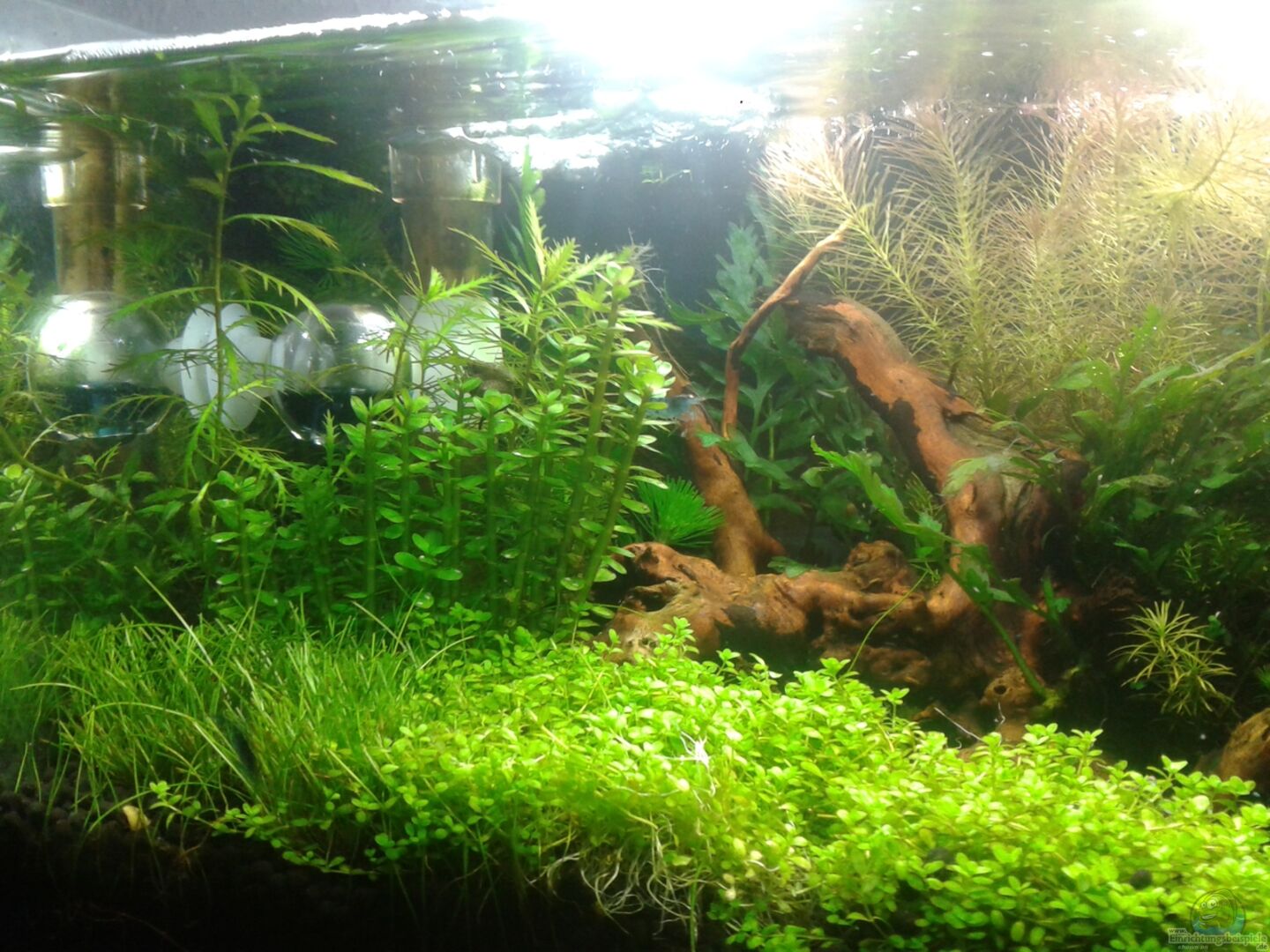 Zuchtbecken für blaue Tigergarnelen. Alle 3 Becken sind ein wenig im Aquascaping-Stil angelegt und sind durch den starken Pflanzenwuchs passend für die Bedürfnisse der Garnelen eingerichtet. Rückscheibe + eine Seitenscheibe sind für mehr Tiefenwirkung mit schwarzer Folie beklebt.