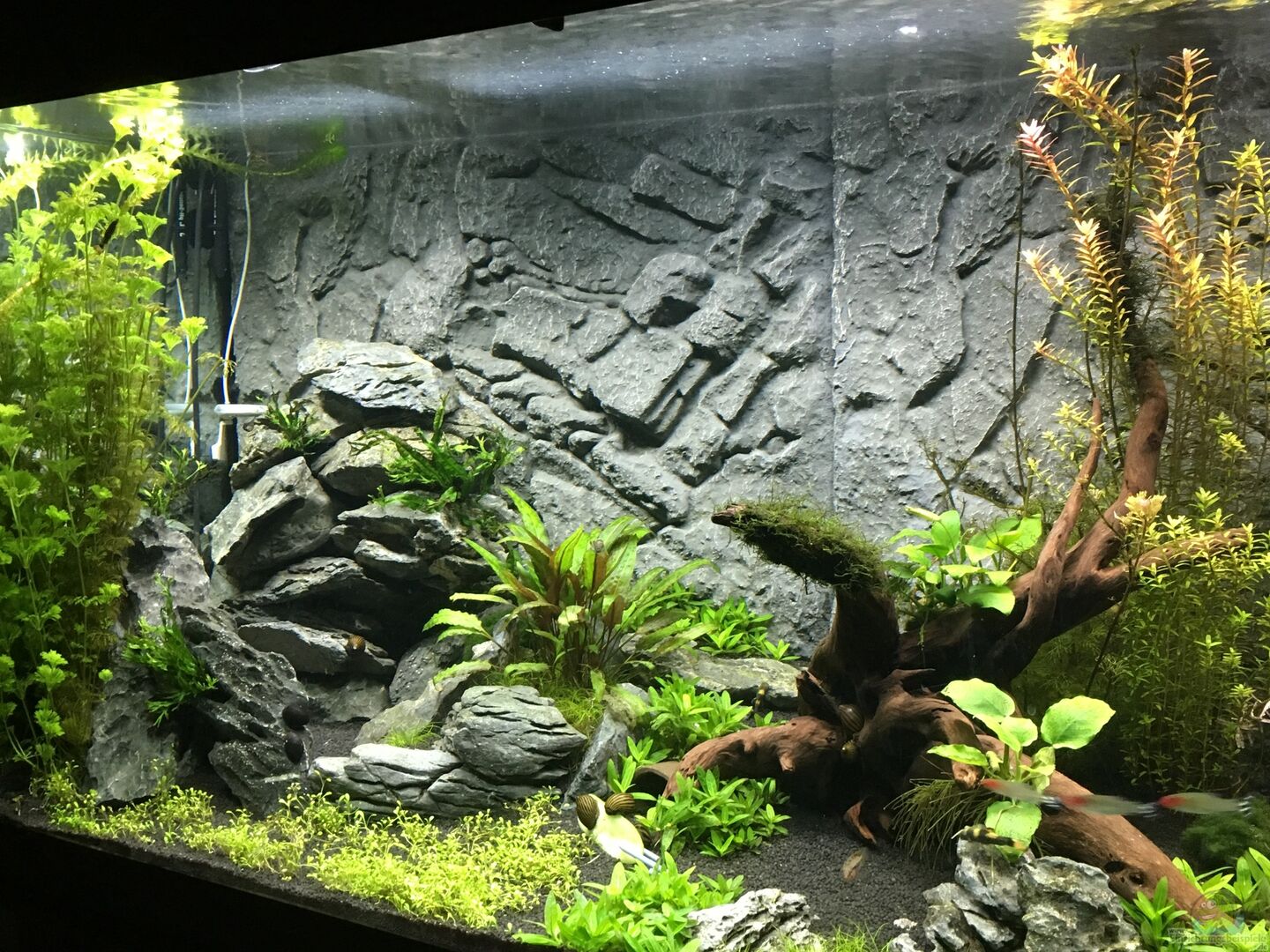 Als Rückwand benutze ich die "Stone Granit" von Juwel. Diese habe ich dann mit einem standard Aquarienkleber befestigt. Auf den Boden habe ich eine 2mm Plexiglasscheibe gelegt, damit das Glas nicht durch die Steine beschädigt wird. Die Platte am besten vor der Rückwand einsetzen. ich bekam die Platte nicht mehr rein und habe sie in der mitte geteilt. Beim Einkleben der Rückwand habe ich ca. 1cm Abstand vom boden gelassen. Da dies mein zweites Becken ist, habe ich die Filtermedien [...]