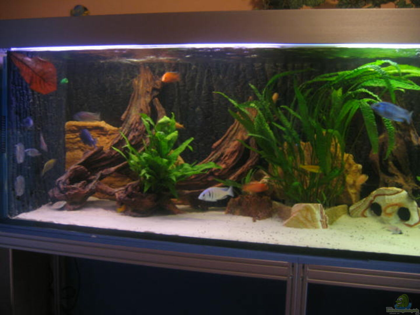 Aquarium wulstverklebt, 12 mm Glas / Bodenplatte 15 mm, integrierter 3 Kammerbioinnenfilter 20 cm x 60 cm x 65 cm, Abdeckung aus Kunststoff mit 4 abnehmbaren Klappen, 2 Aluleuchtstoffbalken mit 4 x 38 W, Untergestell aus Aluminiumprofilen