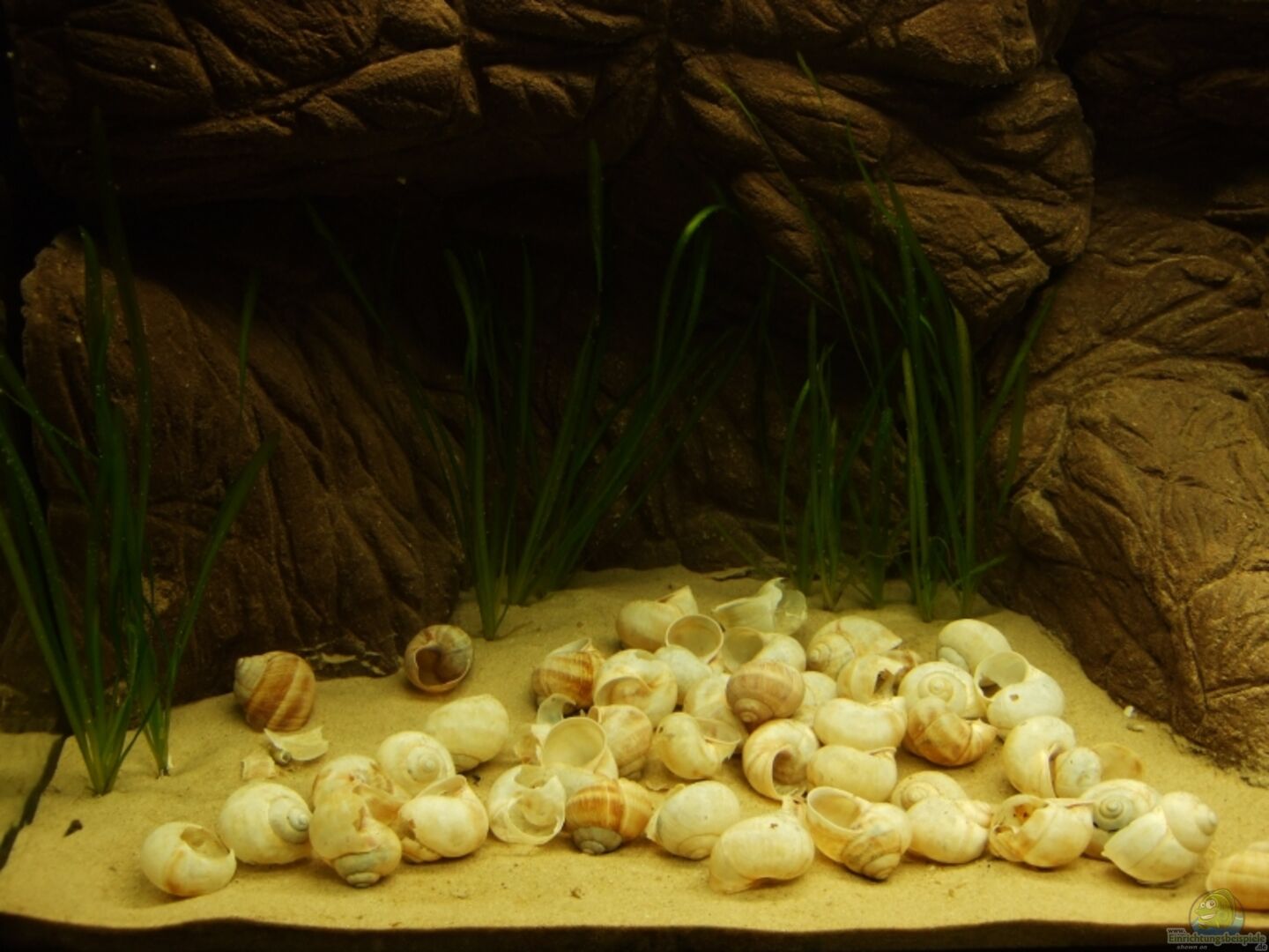 Selbstgebaute Felsrückwand aus Portlandzement bestehend aus drei Modulen, die ich mit brauner Abtönfarbe noch etwas abgedunkelt habe. Hinter dem Element ganz rechts versteckt sich der HMF. Das mittlere Element ist so gebaut, dass das Becken in zwei ungleich gro??e Reviere aufgeteilt wird.