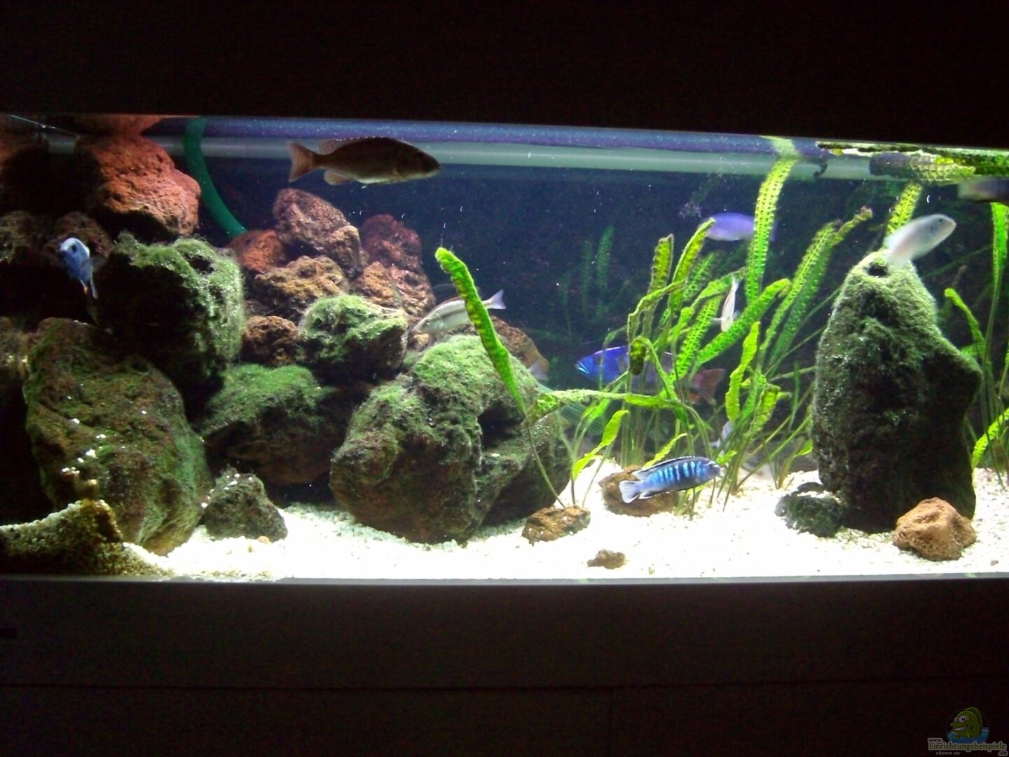 Hier findest Du traumhaft schöne Aquarien, die mit Buntbarschen der Art Nimbochromis livingstonii (Schläfer) aus dem Malawisee besetzt sind.