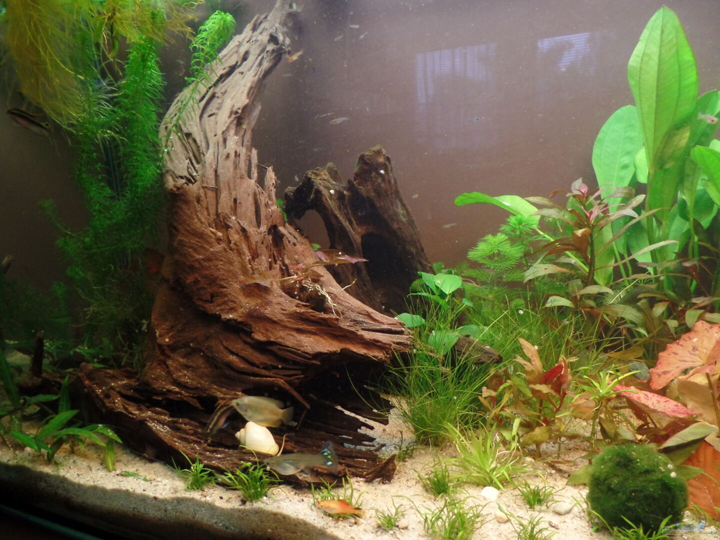 Links und Rechts sind unter den Querstreben Abdeckung vom Kabelkanal angeklebt. Der befindet sich auf Wasserspiegelhöhe und hält somit die Schwimmpflanzen in der linken und rechten Ecke. Schön für meine Fadenfische.