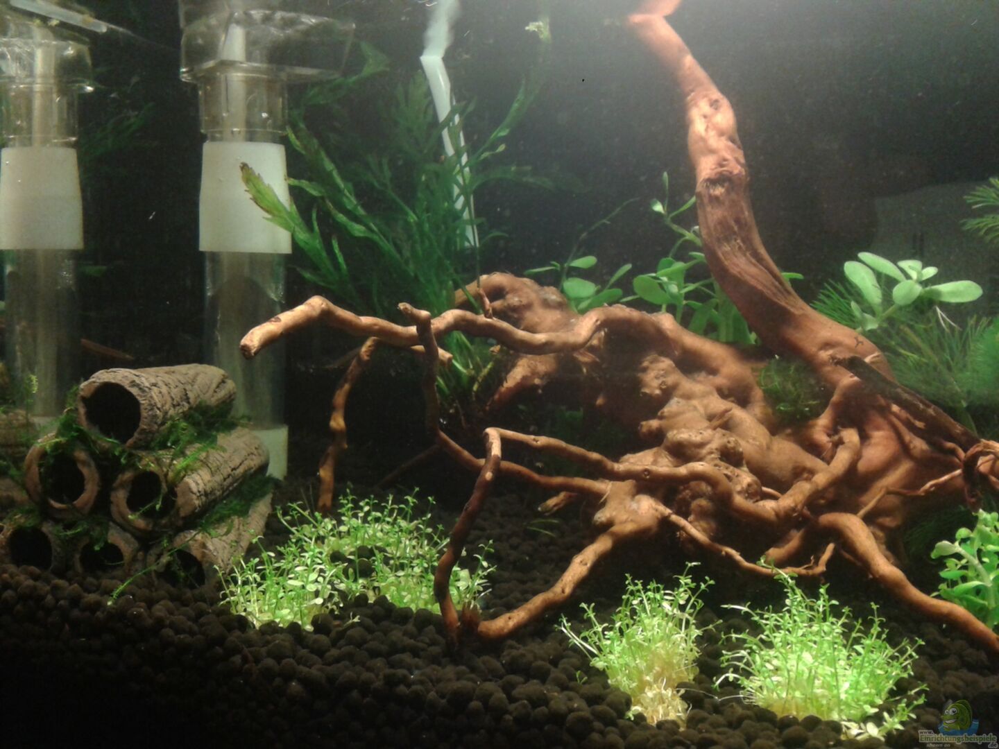 Zuchtbecken für Rote Taiwan Sakura Garnelen. Alle 3 Becken sind ein wenig im Aquascaping-Stil angelegt und sind durch den starken Pflanzenwuchs passend für die Bedürfnisse der Garnelen eingerichtet. Rückscheibe + eine Seitenscheibe sind für mehr Tiefenwirkung mit schwarzer Folie beklebt.