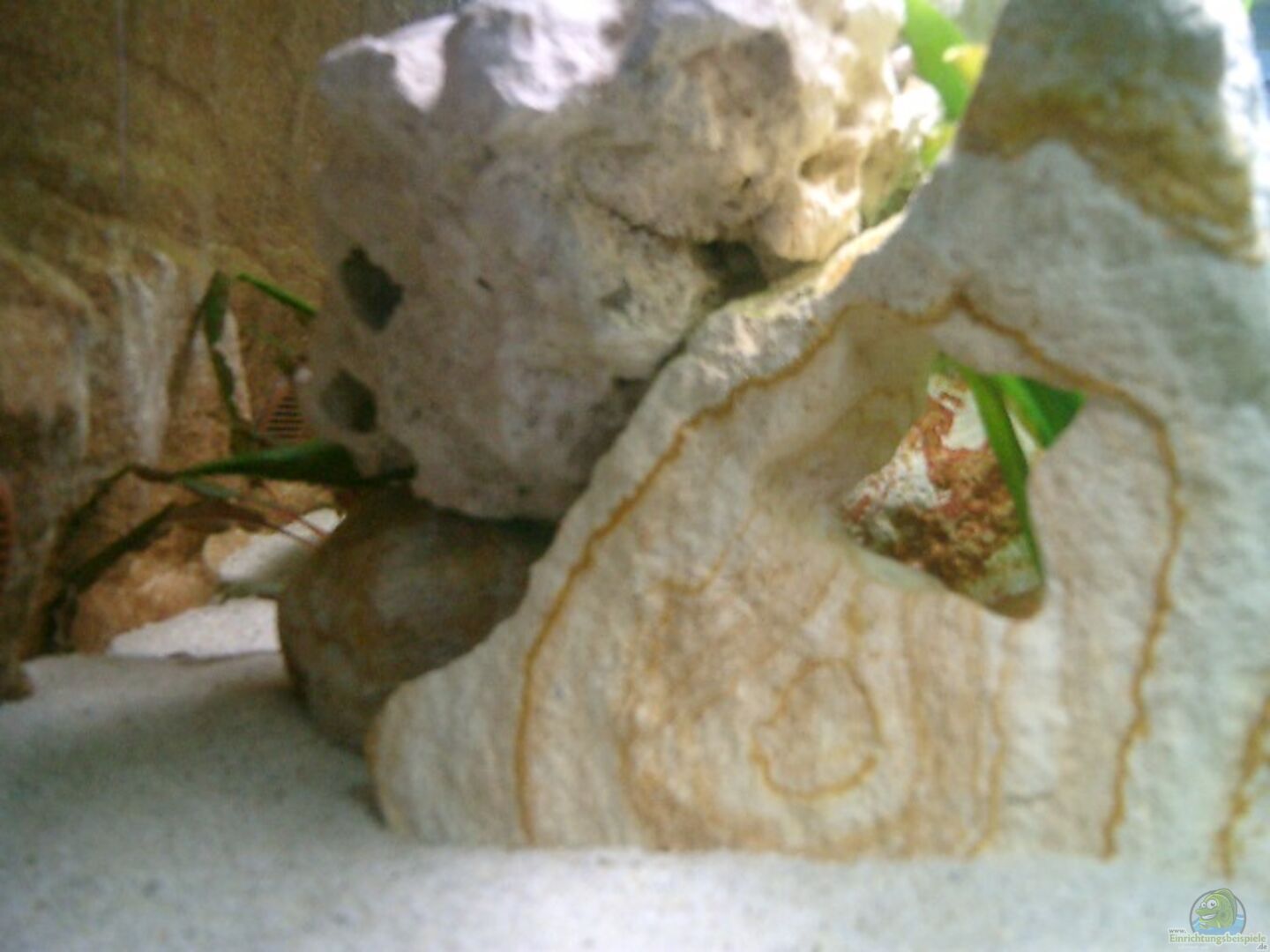 Ich habe eine Rückwand in Felswand-optik aus GFK eingesetzt (verklebt mit Aquariumsilikon). In die Rückwand wurden runde Möbelbelüftungsgitter eingesetzt um den Wasseraustausch zu gewährleisten. Die Rückwand ist für die Fische problemlos hinterschwimmbar.