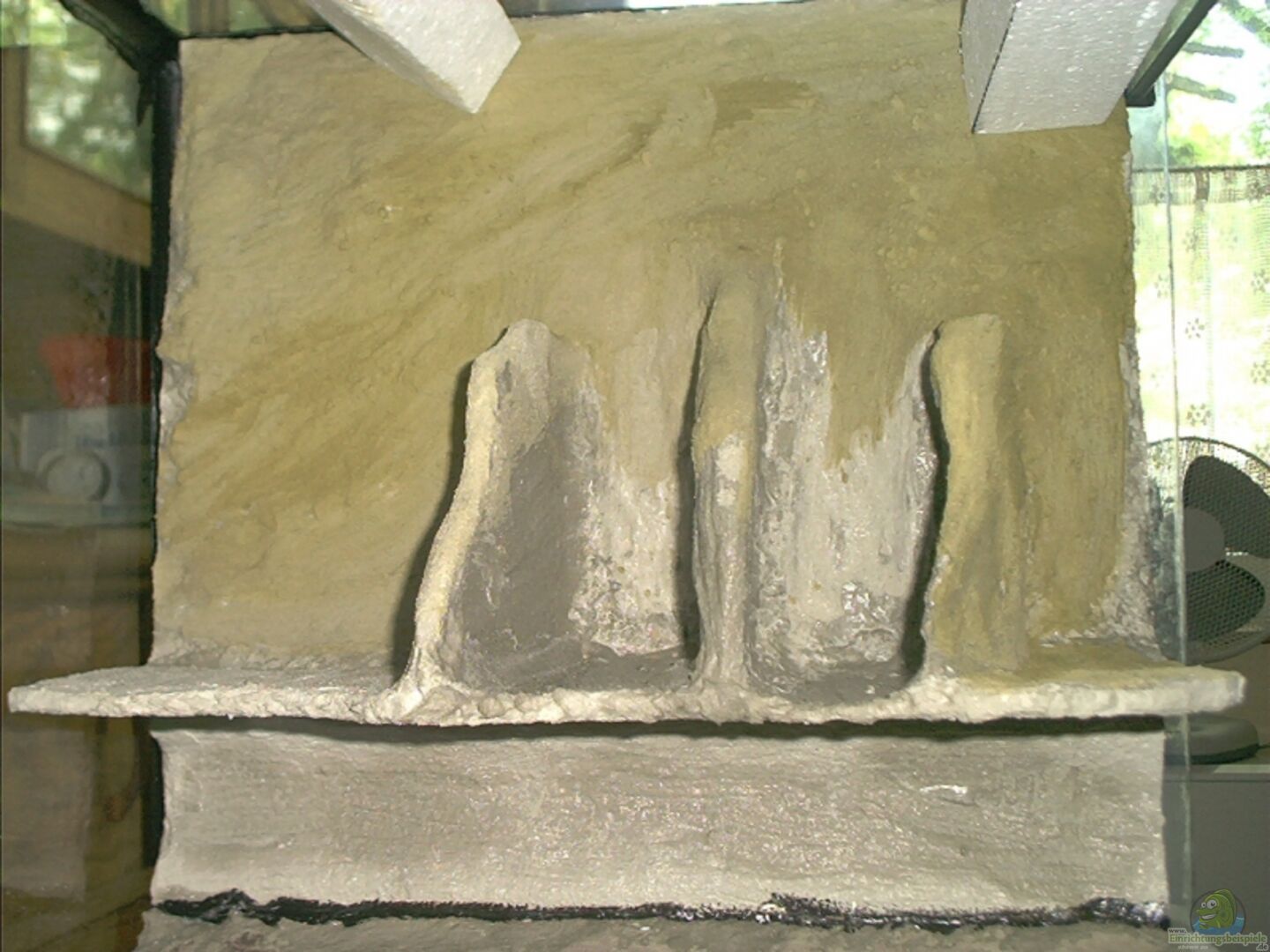 Rückwand und Seiten Selbstbau aus Styropor und Estrichzement, eingefärbt mit Abtönkonzentrat für Wanddispersionsfarbe. Nachbehandelt mit 2 Kommponenten Epoxiedharz 2 mal Gestrichen. Gewässert 14 Tage und mit Aktivekohle gefiltert. Bruchnatursteine Braun-rötlich