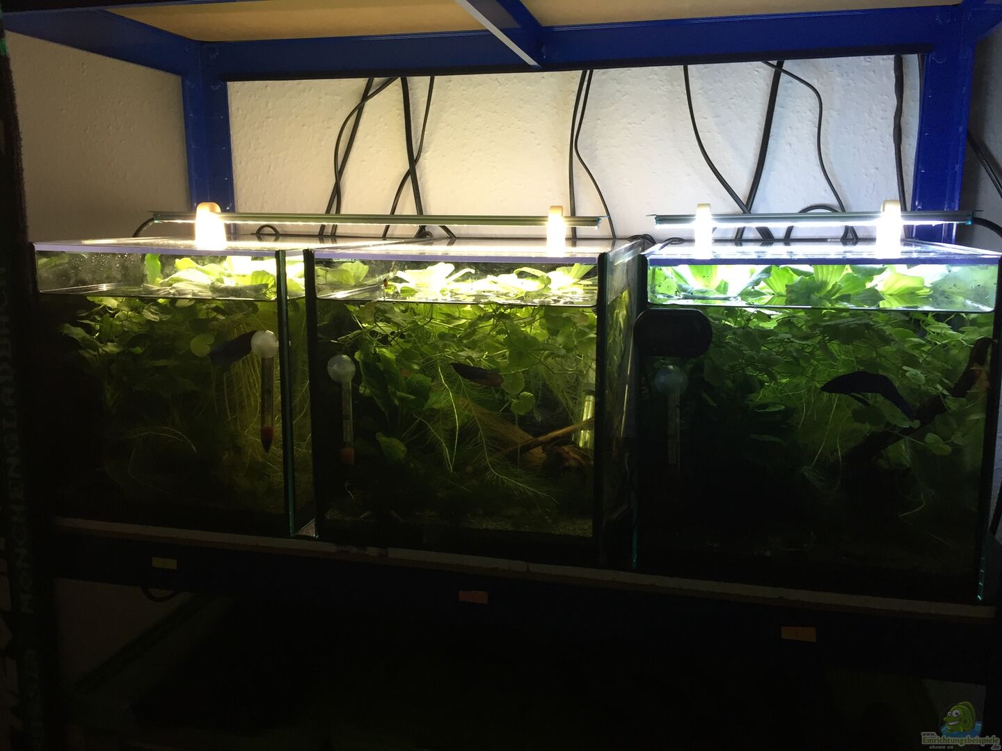 Es handelt sich um 3 einzelne 25 Liter Aquarien. Die Seiten- und Rückscheiben sind mit schwarzer Klebefolie beklebt, damit sich die drei Kampffische nicht sehen können. Die Aquarien sind mit Plexiglasscheiben abgedeckt.