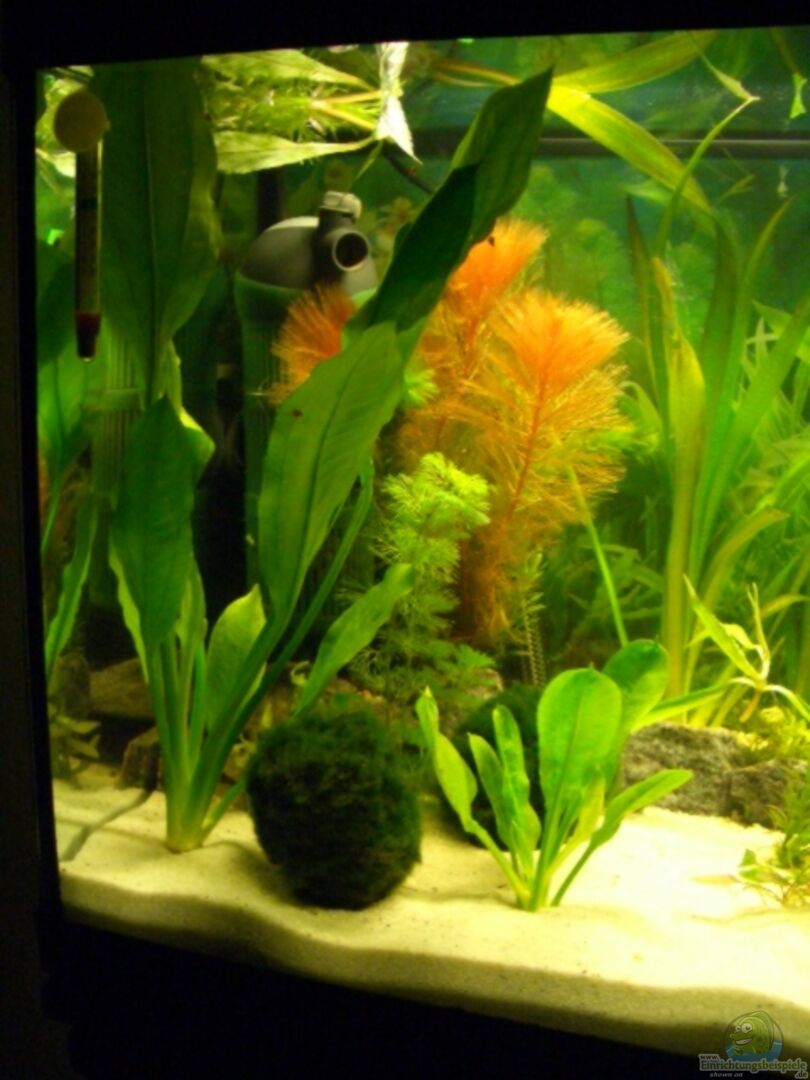 hinten in der Mitte das rote ist wahrscheinlich eine Alternanthera, davor der Indische Wasserstern (Hygrophila difformis), links und rechts der Alternanthera stehen wahrscheinlich Vallisnerien rechter Rand der Sandgrube eine Cabomba, Mosskugeln, bei den anderen Pflanzen bin ich mir gar nicht sicher, was es sein könnte. Mosskugeln