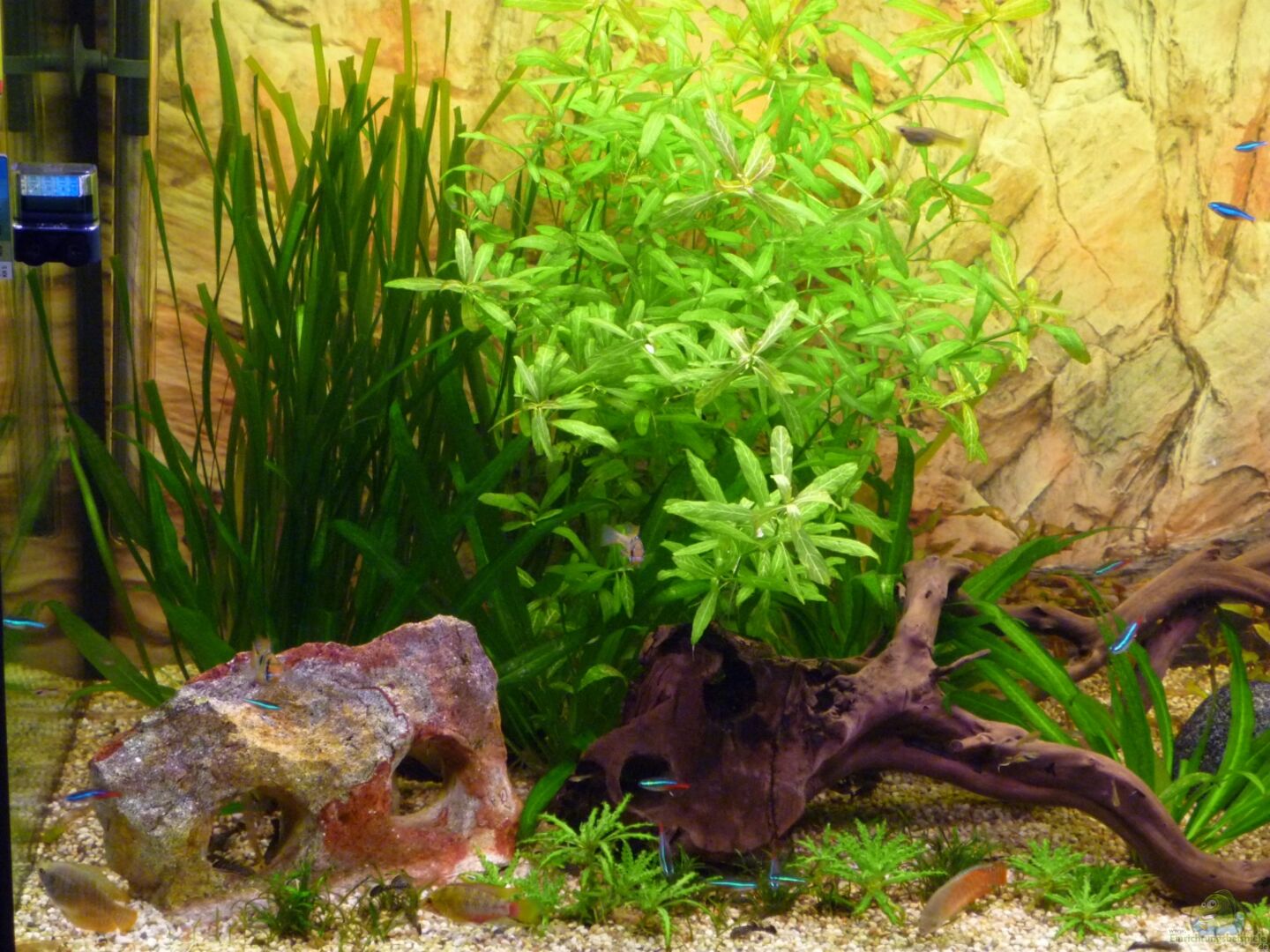 Das Becken hat ein Rückwandbild, dies wurde vom Aquarienbauer mit einem speziellen Verfahren auf der Rückseite aufgebracht. Dadurch kein Platzverlust durch Rückwand im Innenbereich und keine Blasenbildung oder andere unschöne Effekte durch Rückwandposter. Den Unterschrank habe ich komplett selbst gebaut. Untere Platte Küchenarbeitsplatte, Aufbau mit Porenbetonsteinen, obere Platte ebenfalls Küchenarbeitsplatte Schiebetüren aus lackiertem Glas