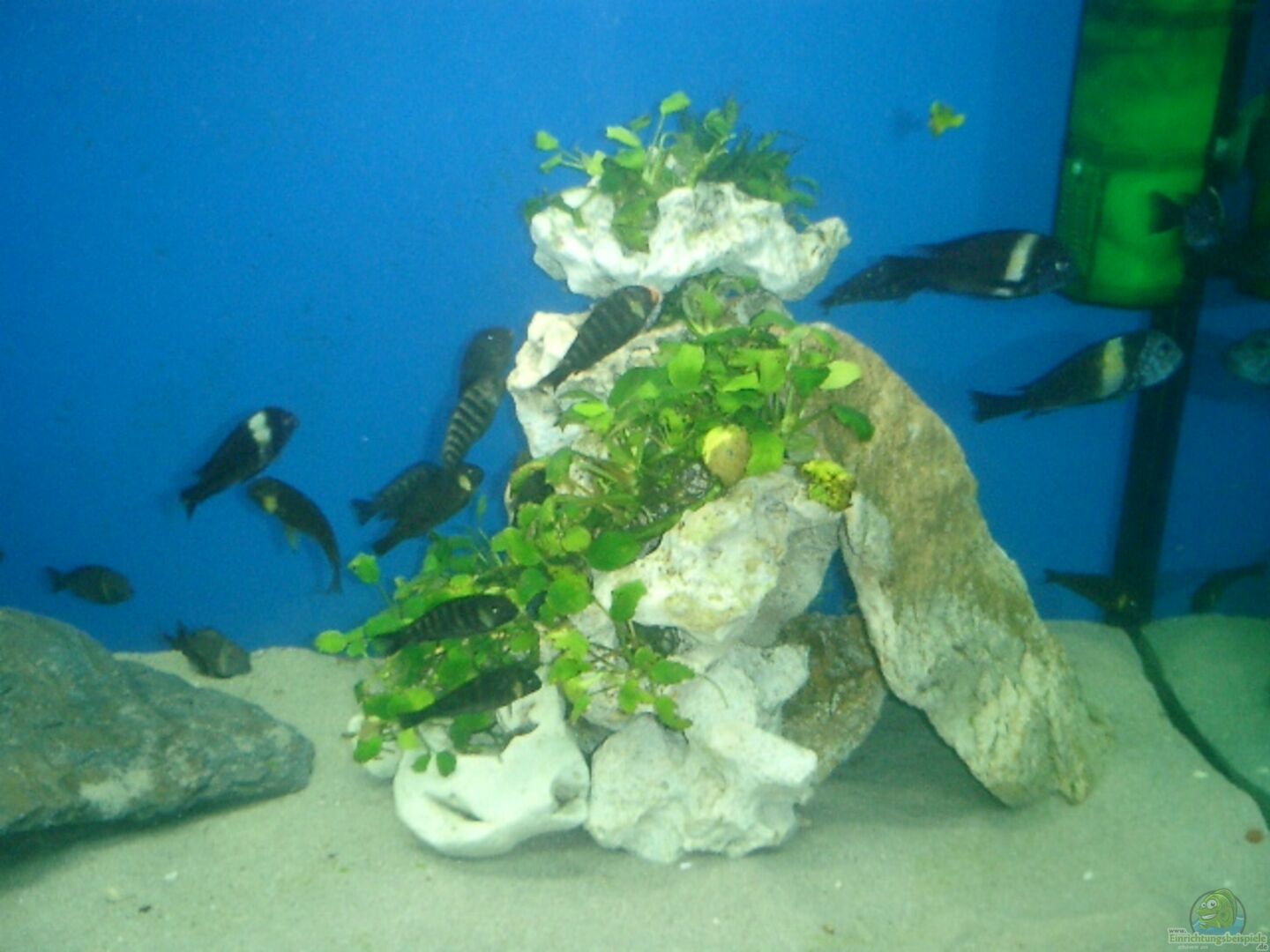 45 kg afrikanisches Lochgestein, 40 kg kenianisches Lochgestein und zwei Steinplatten, deren Herrkunft ich nicht bestimmen kann, wurden zu einem gro??en Steinhaufen in der rechten Seite und einem kleineren in der linken aufgebaut. In der Mitte liegen zwei Steinplatten als Laichplatz. Mit der Deko wollte ich mehr Schwimmraum schaffen und habe mich schlie??lich für diese Variante entschlossen. Der gro??e Steinhaufen bietet genügend Versteckplätze.