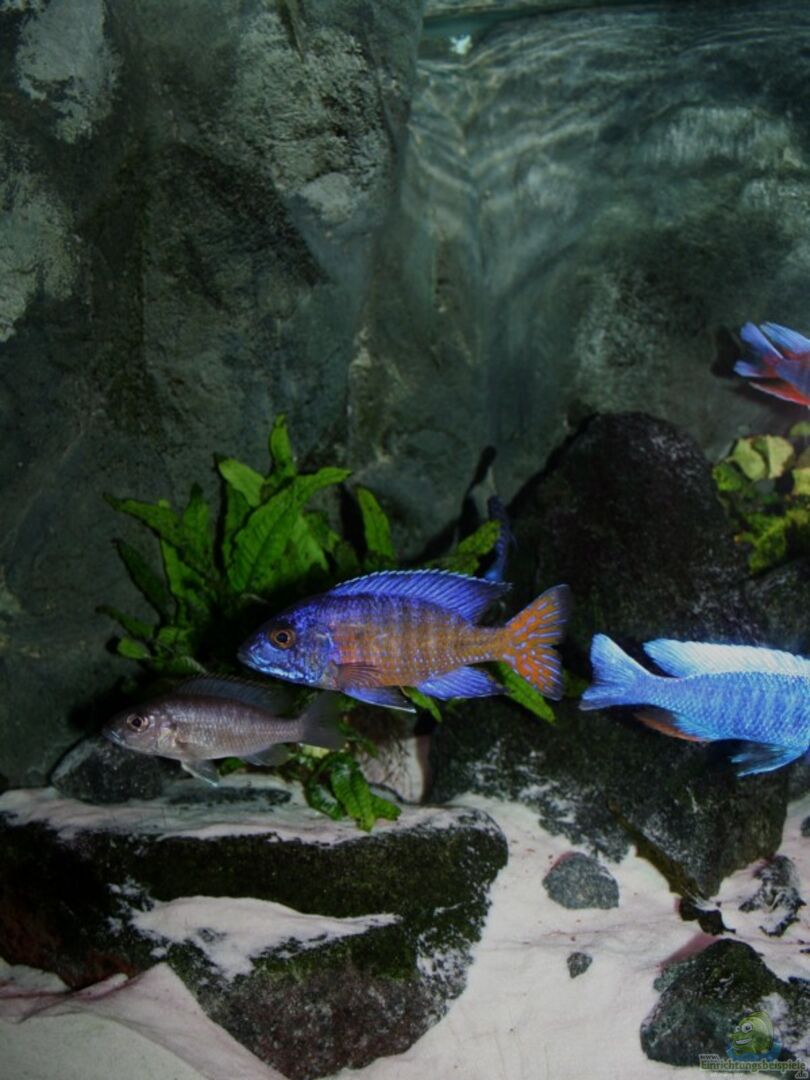 selbstgebastelte Kunstfelsen mit integriertem Felsüberhang in Verbindung mit Granit-Basalt-Steinen aus dem heimischen Steinbruch; Hintergrund selbstgemalt - Unterwasser-Landschaft im Malawisee