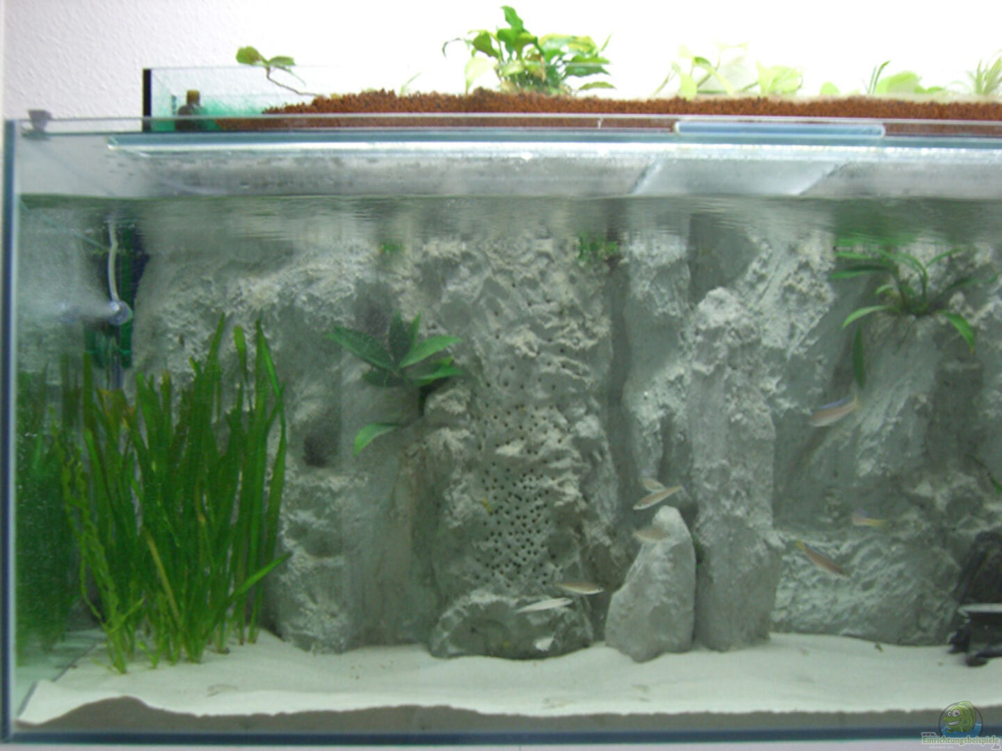 Das Aquarium steht im unbeheizten Flur und ist schon Blickfang beim Eintritt. Im rechten Eck ist eine Glasscheibe mit ??berlaufkamm eingeklebt. ??ber dem Becken ist auf einem Regal ein bepflanztes Hydrokultur-Filterbecken installiert.